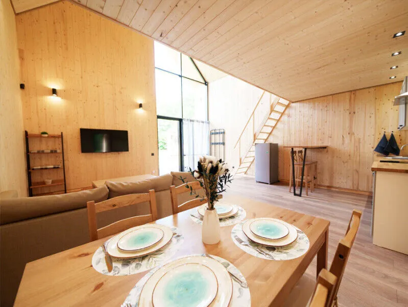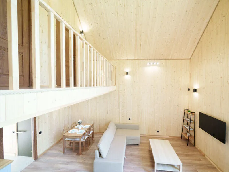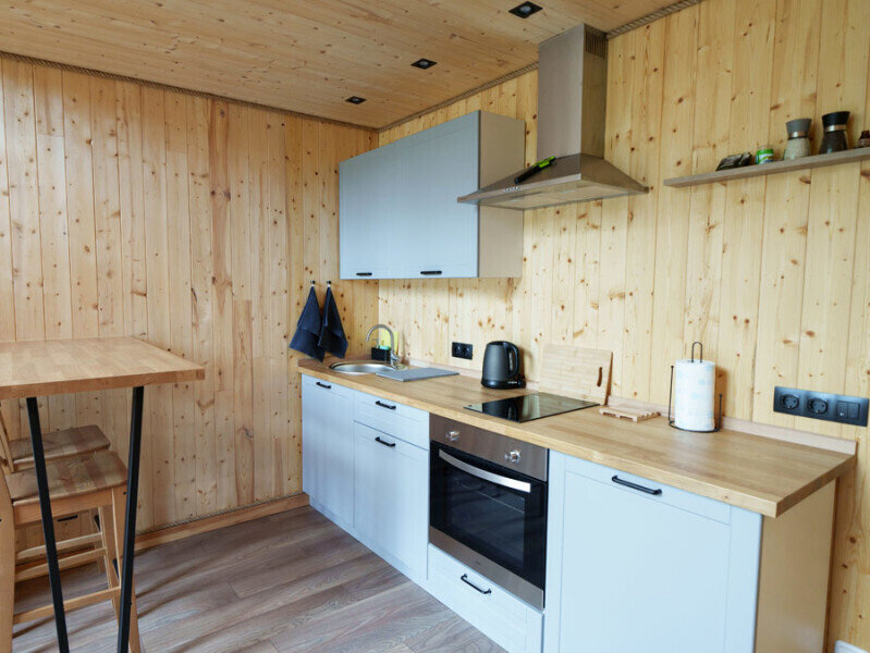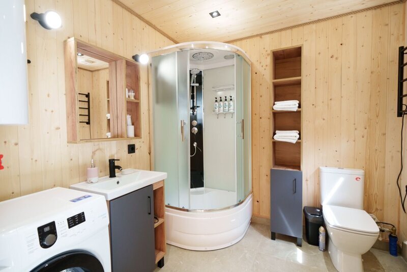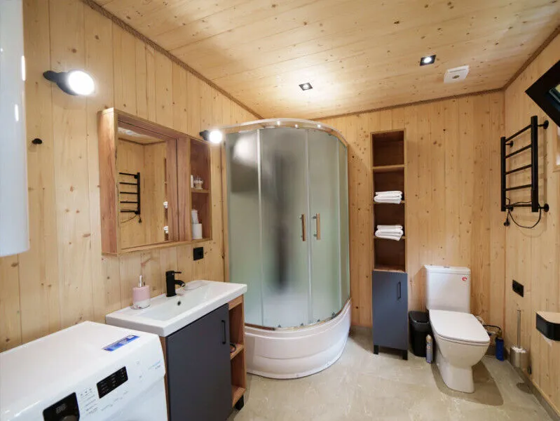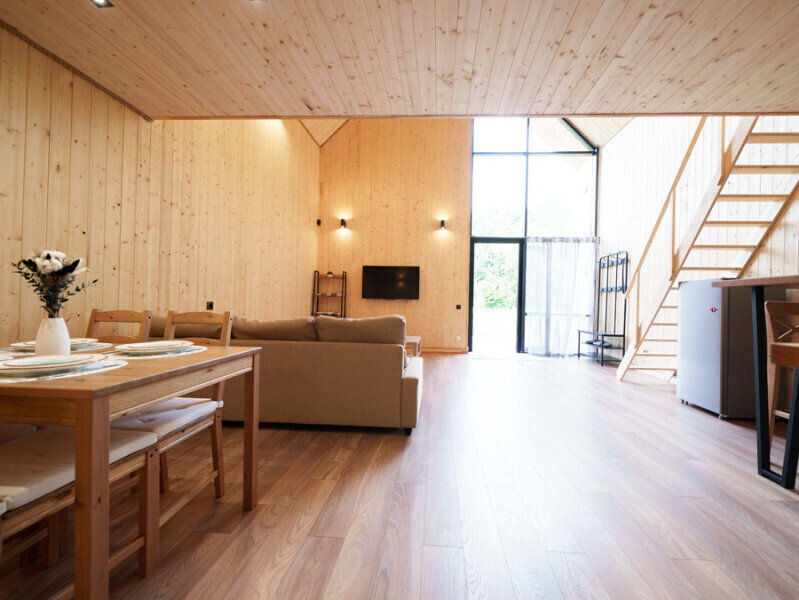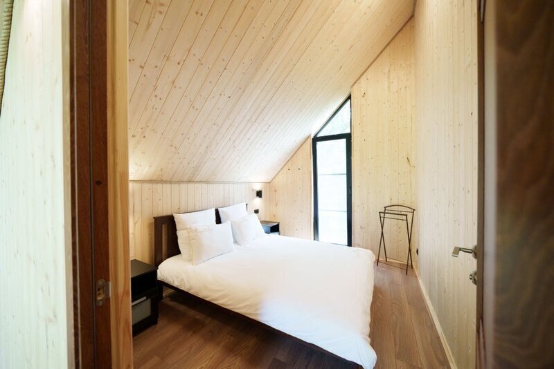 Внутри каждого домика вы найдете все необходимое для комфортного отдыха двоих, семьи или компании друзей. Уютные спальни с панорамными окнами, выходящими на окружающий лес, оборудованы качественными матрасами и постельным бельем высокого стандарта.