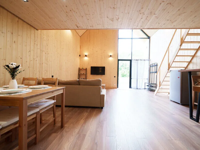 Семейный отдыхДостоинстваМы провели незабываемую неделю в этом удивительном месте. Дом оказался идеальным - просторный, уютный, снабженный всем необходимым для комфортного проживания. Внутри можно найти все, что только можно пожелать - от посуды и техники до кофемашины. На террасе устроена уютная зона для отдыха, а также есть собственная сауна для полного расслабления. Сама местность очень симпатичная, вокруг много деревьев, а соседние дома достаточно далеко. На территории безопасно - везде камеры, "посторонних" не пускают. В пределах трех минут езды расположены сетевые магазины, где можно приобрести все необходимые продукты и товары.