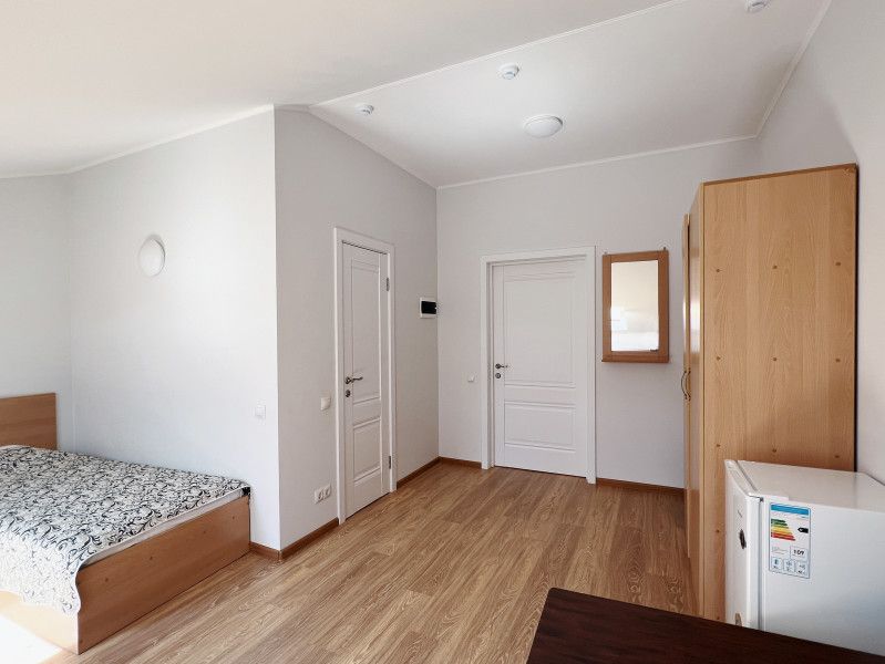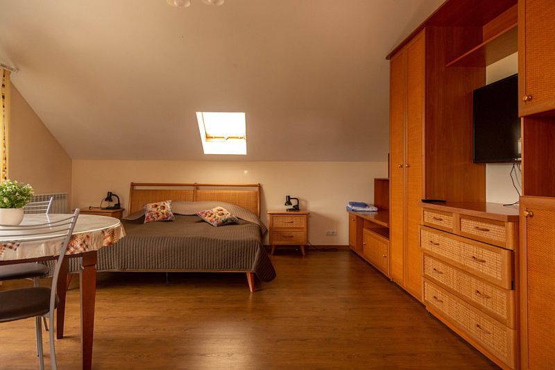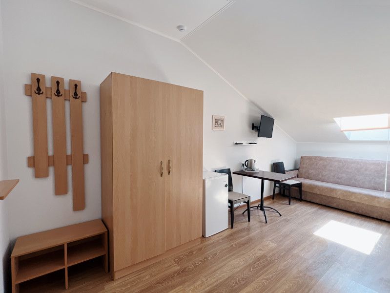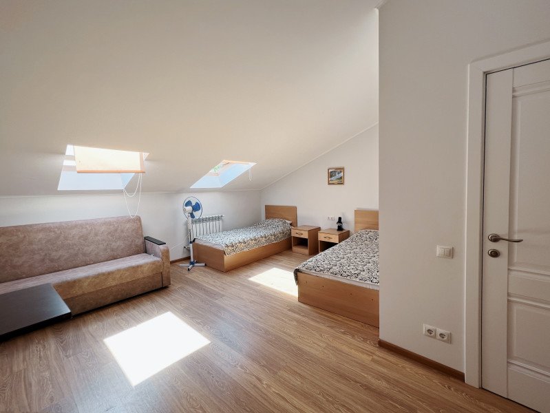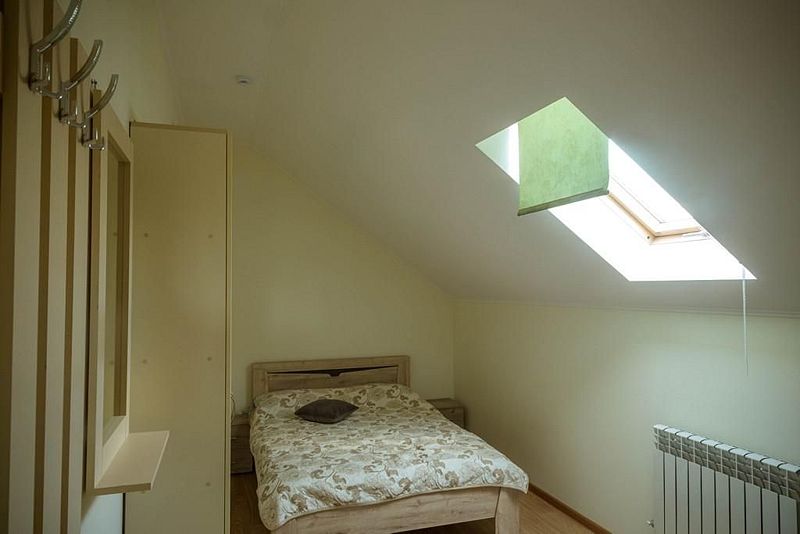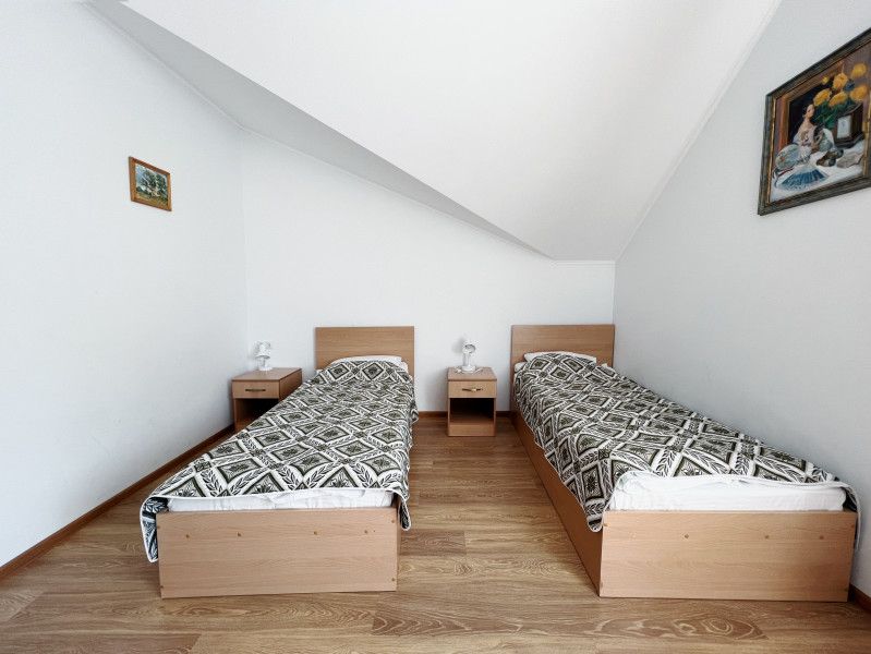 Двухместная комната с 2 кроватями 90x200, и в этой комнате возможно размещение одного дополнительного места — раскладной кровати. Две такие комнаты находятся на 1-м этаже, и две — на 2-м, мансардном этаже.