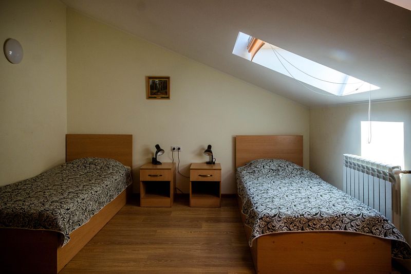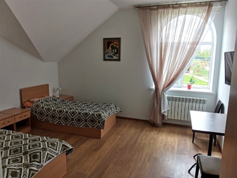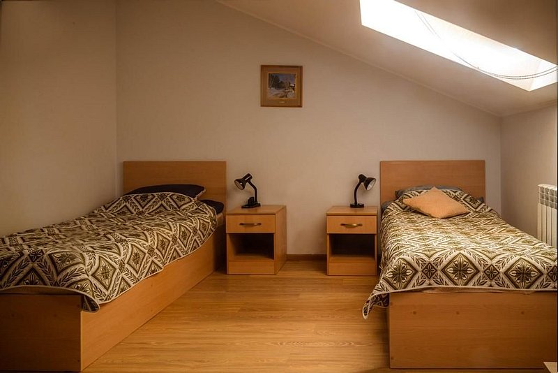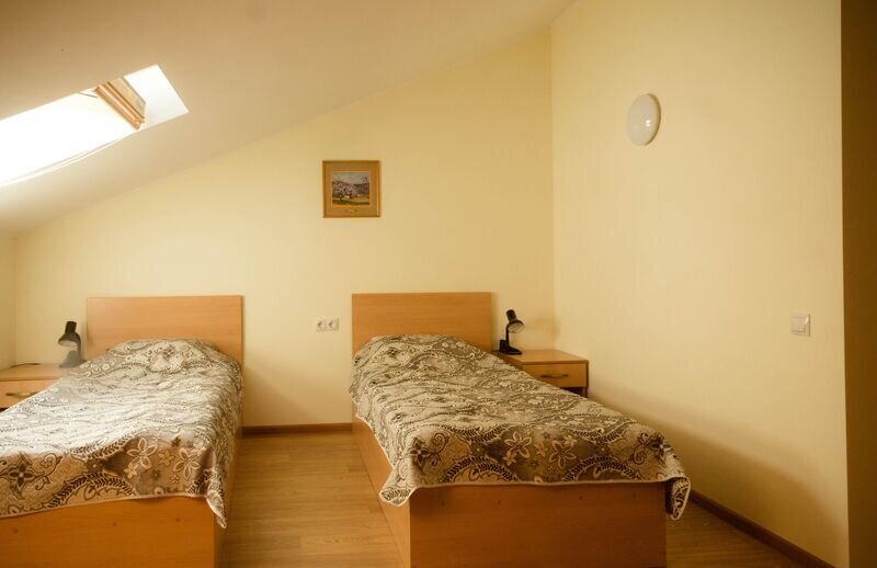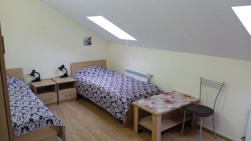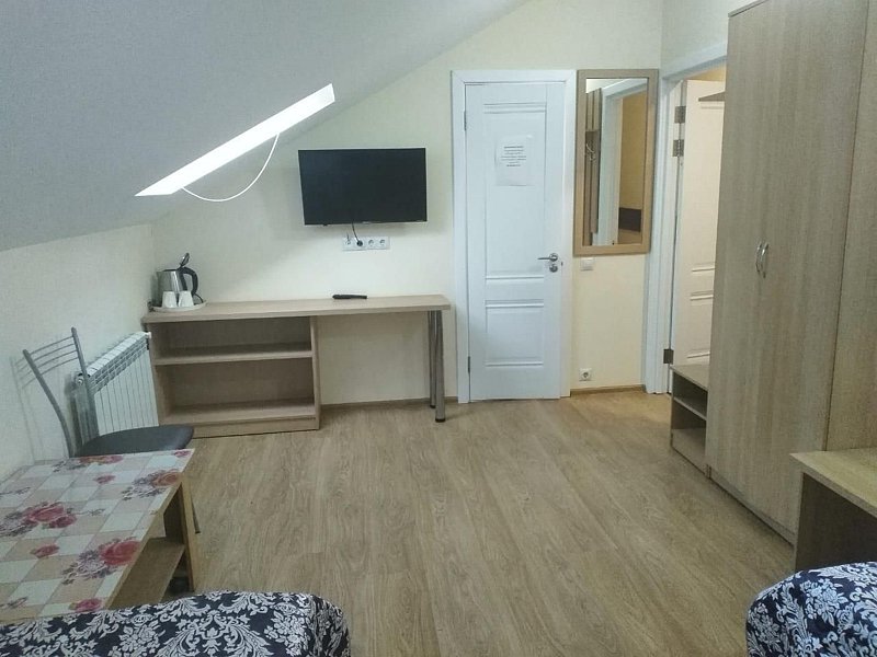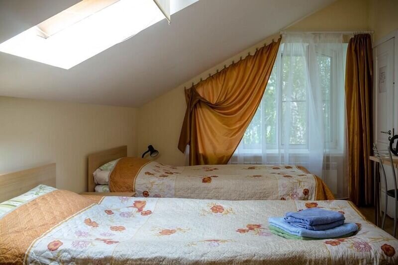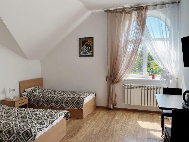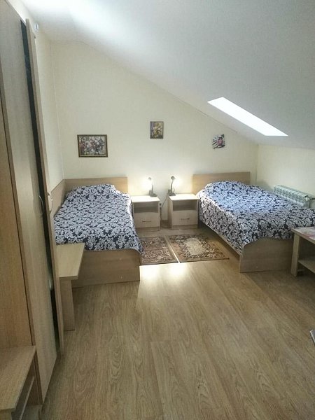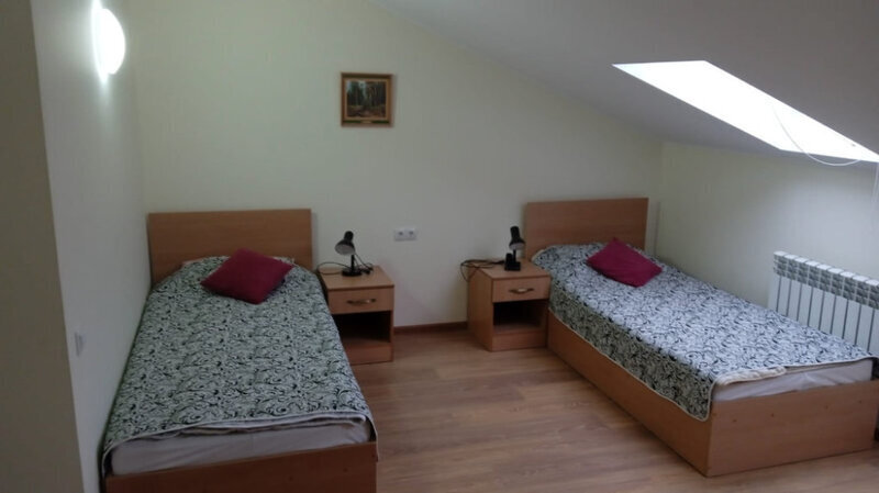 Двухместный номер с 2 кроватями 200x90 и холодильником, в этой комнате возможно размещение одного дополнительного места — раскладной кровати. Комната находится на 2-м мансардном этаже.