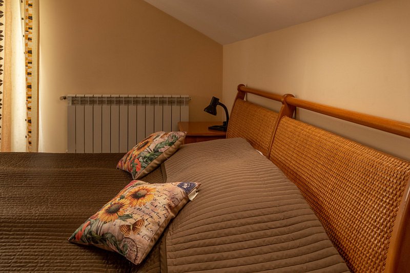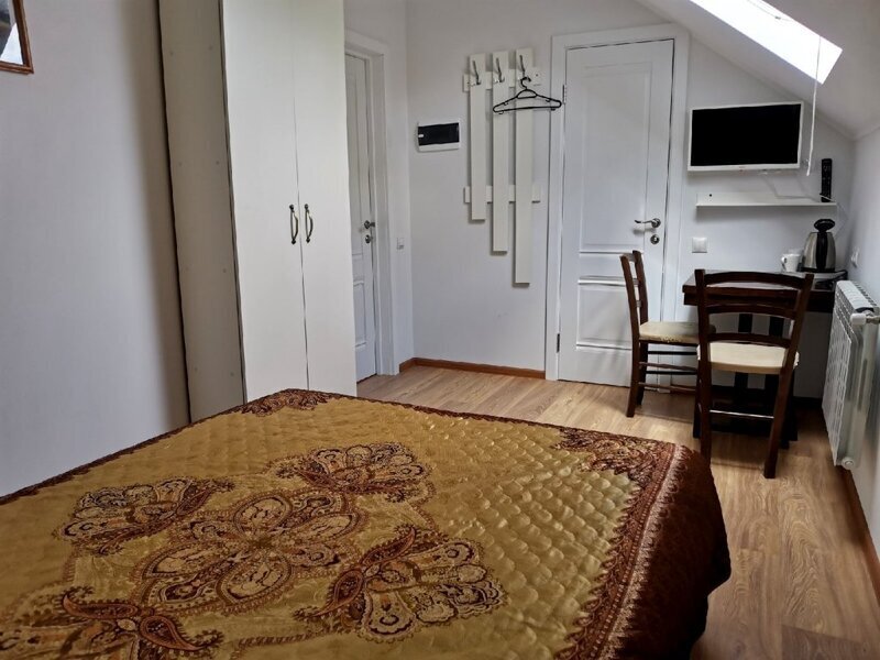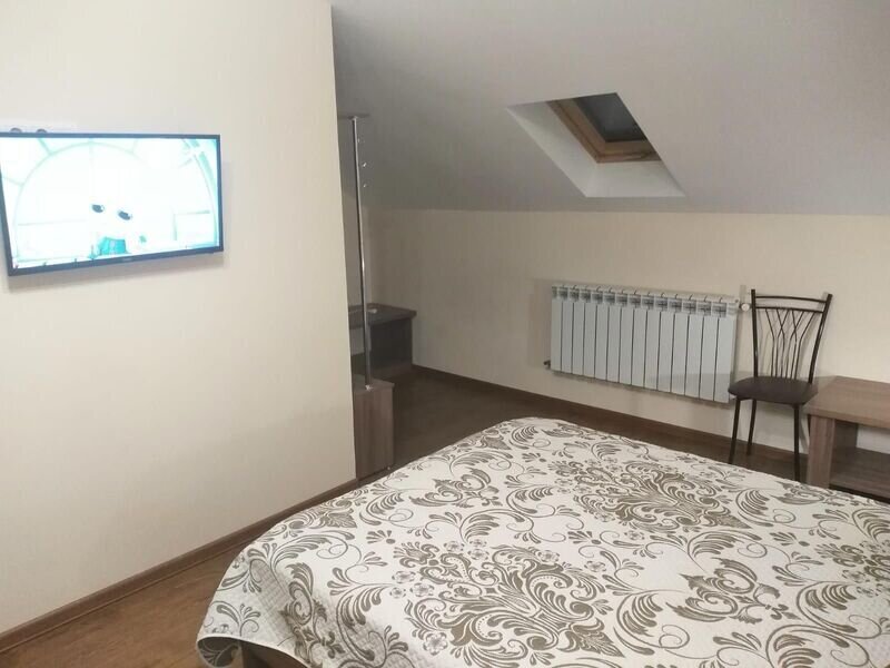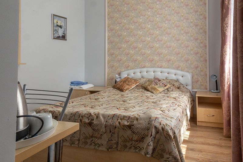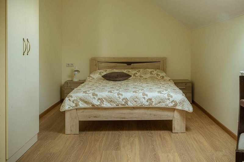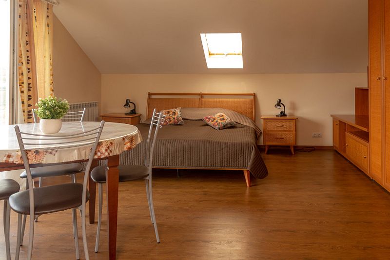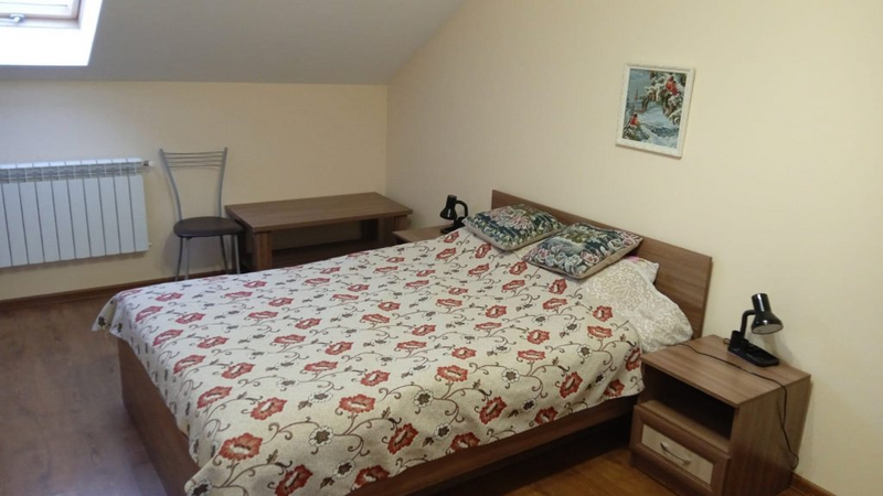 Двухместная комната с одной двуспальной кроватью 140*200. Две такие комнаты находятся на 1-м этаже, и две, — на 2-м, мансардном.