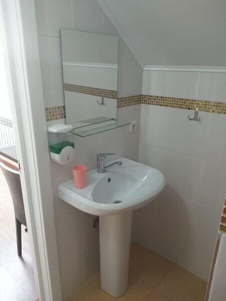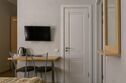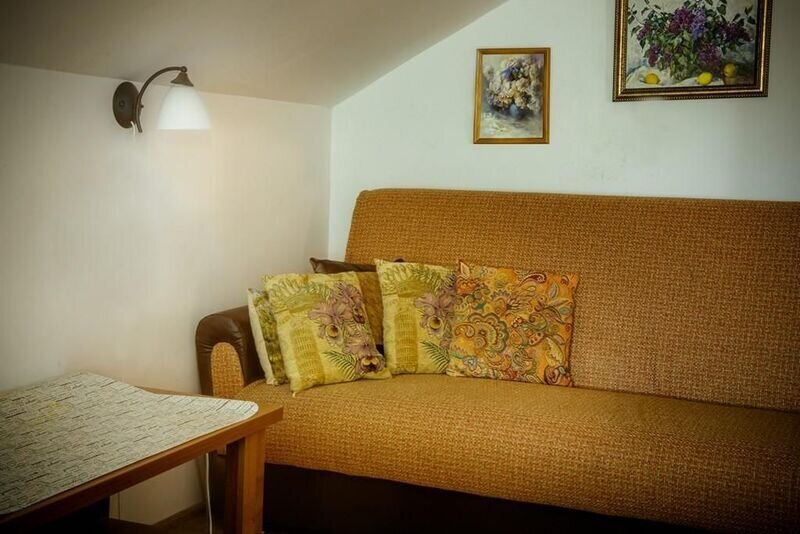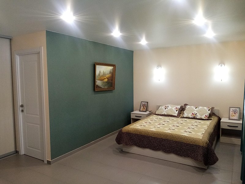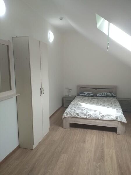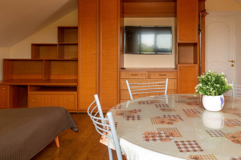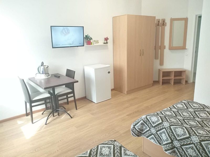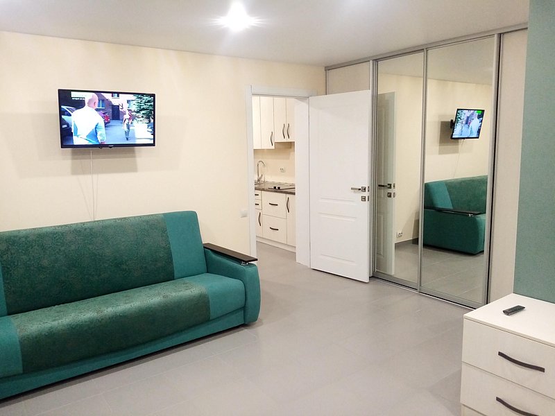 В спальне огромный зеркальный шкаф-купе, двуспальная кровать 160*200 и двуспальный раскладывающийся диван 140*190. В изолированной кухне есть всё необходимое для самостоятельного приготовления пищи. Есть собственная зона на общей веранде для отдыха на свежем воздухе. Номер находится на первом этаже.