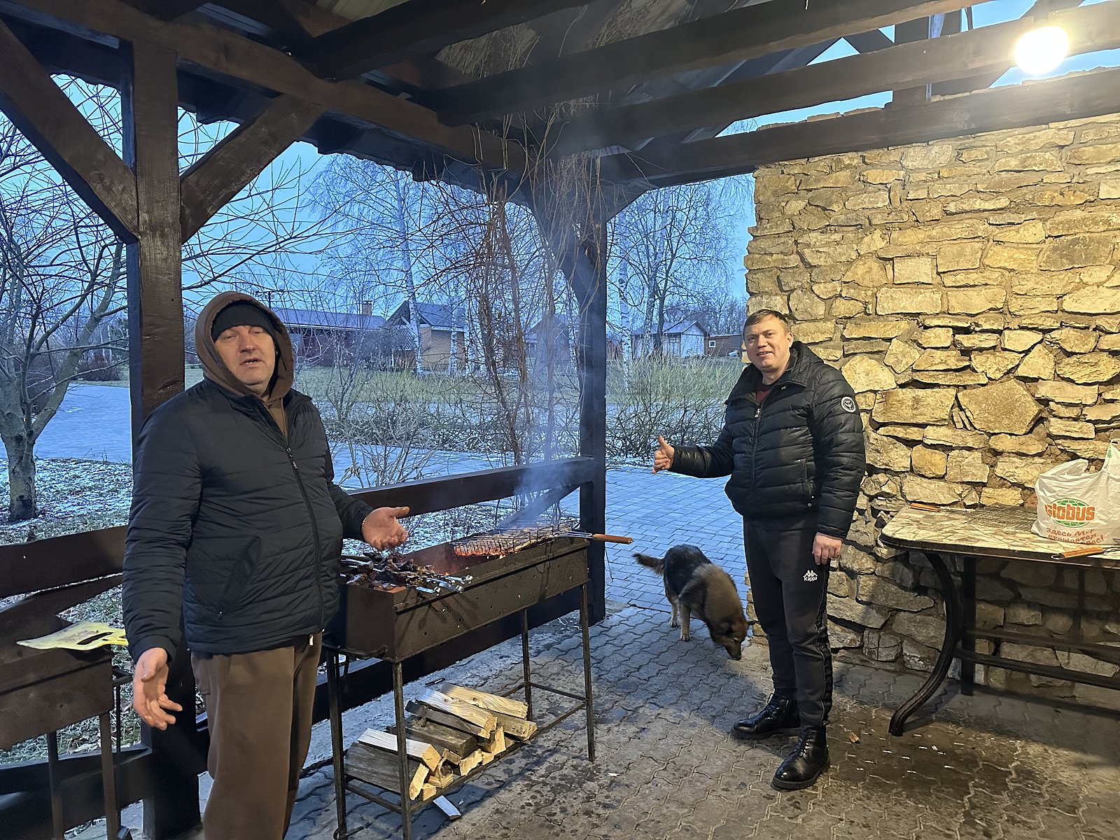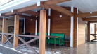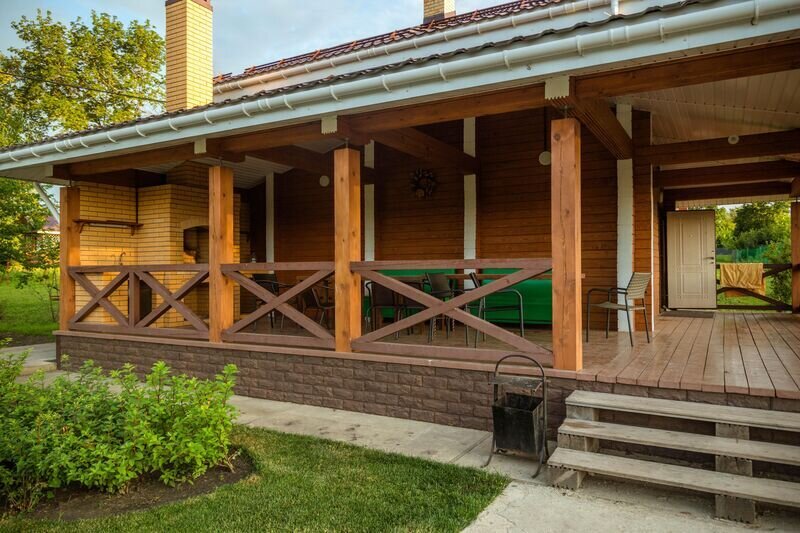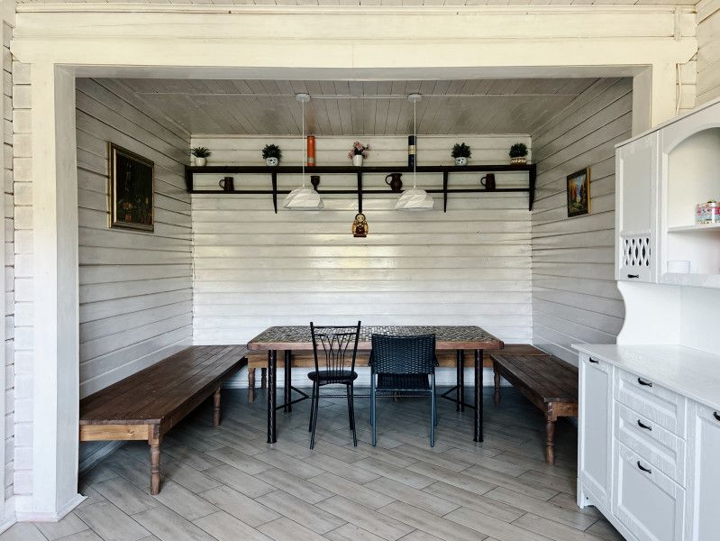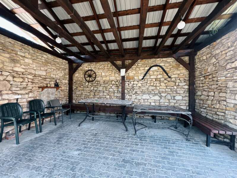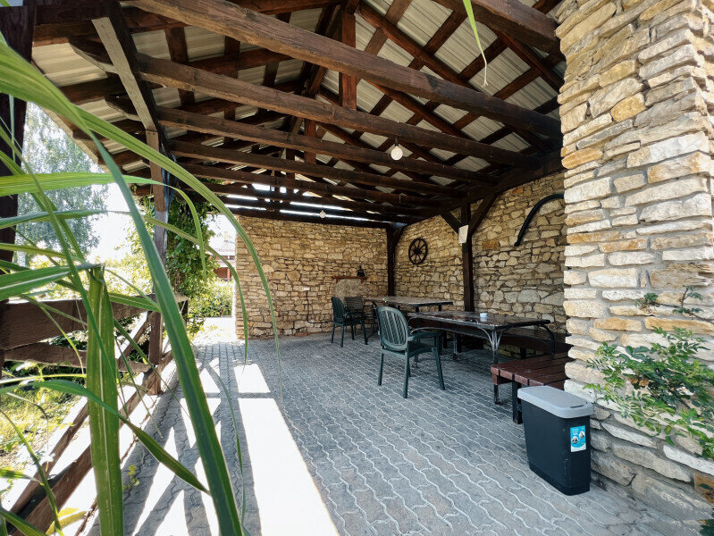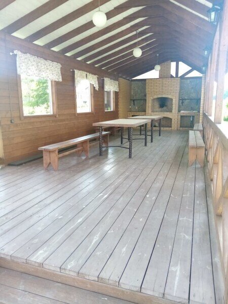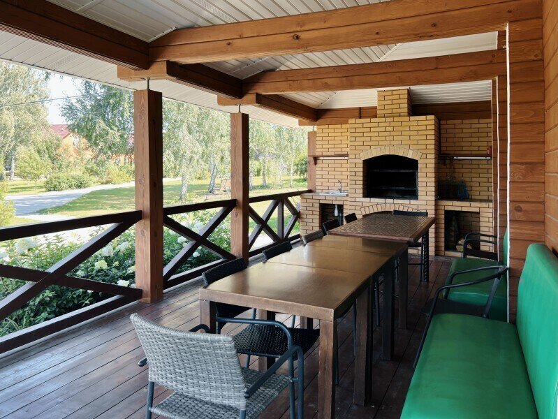 На крытой веранде большой обеденный стол и зона барбекю. Рядом, на улице, чан с подогревом воды дровами. Собственная авто-парковка на 4 автомобиля.