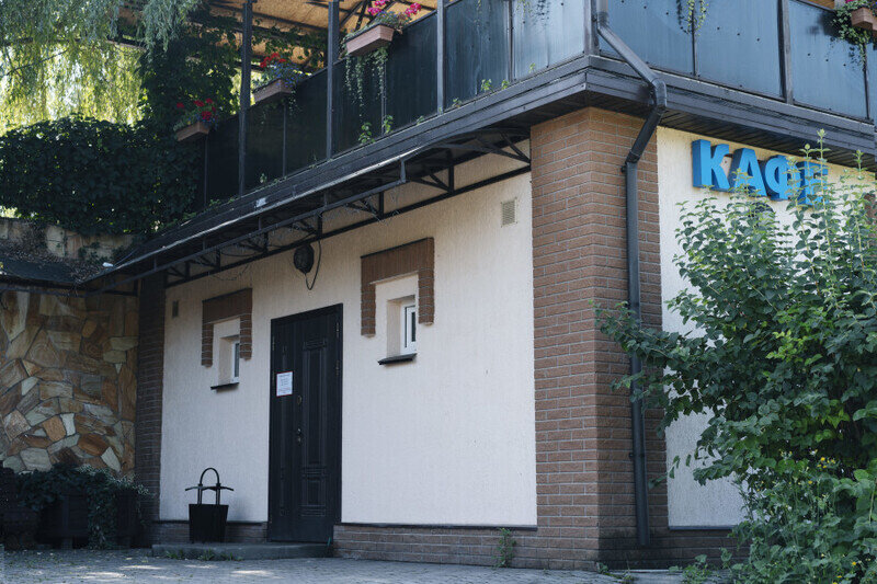 Находится в доме, расположенном в молодом яблоневом саду.