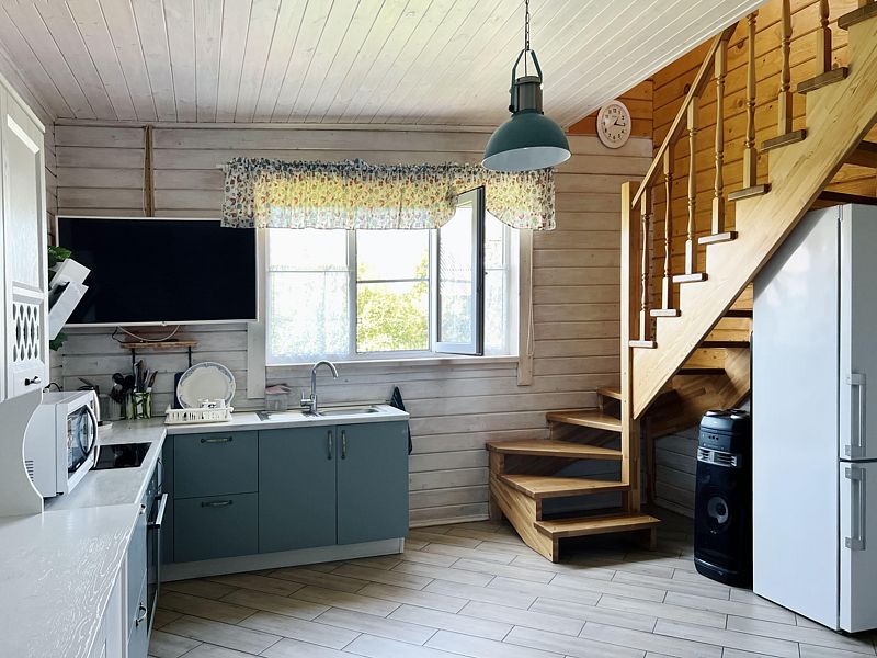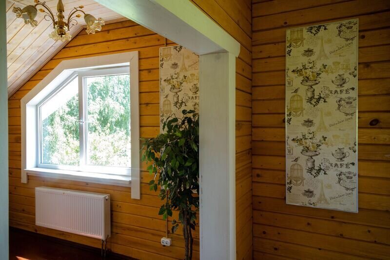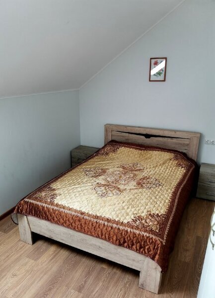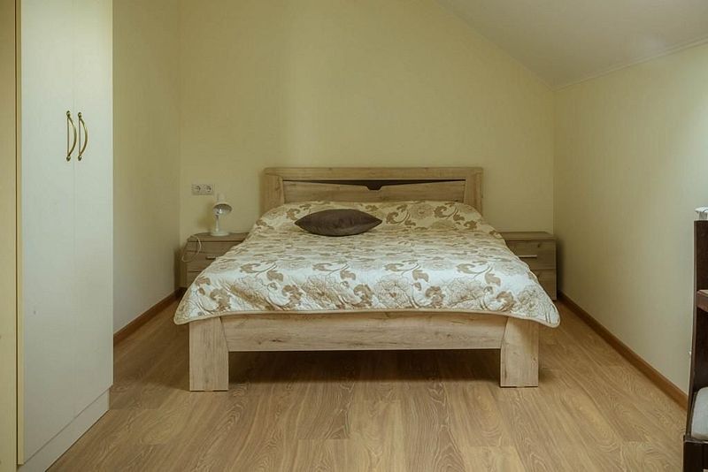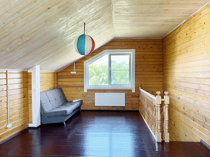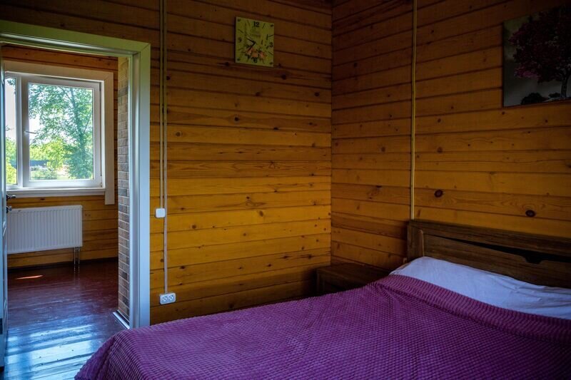 На 1-м этаже: баня на дровах, помещение для переодевания, два душа, «обливайка», просторная гостиная и кухня со всей необходимой техникой и посудой для самостоятельного приготовления пищи. На 2-м этаже изолированная спальня с двуспальной кроватью 160*200, в двух других, проходных гостевых комнатах по одному раскладывающимся дивану 140*190. В этом доме возможно размещение четырех дополнительных мест,— раскладных кроватей.
