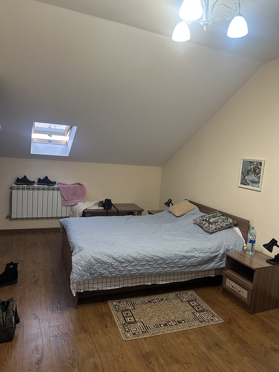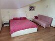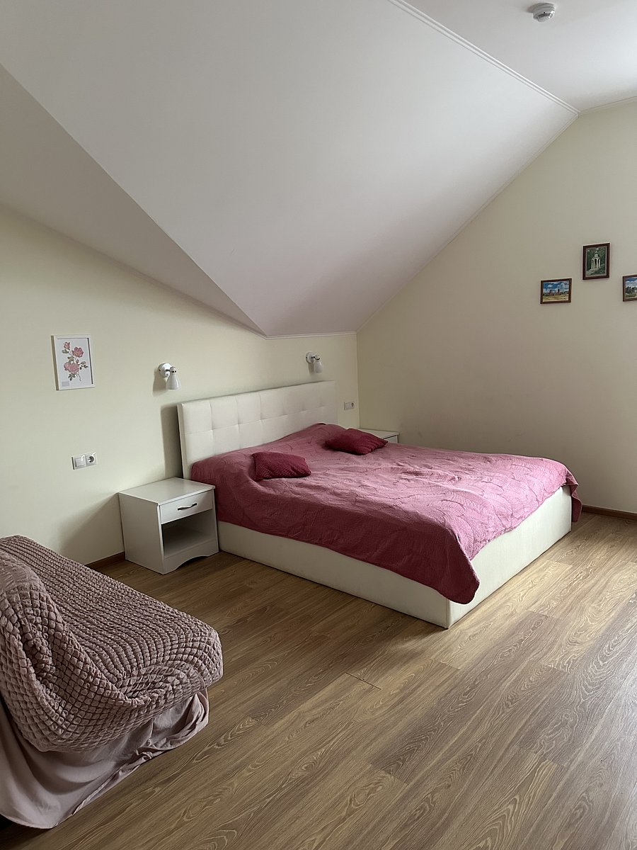 Трехместная комната с одной двуспальной кроватью 160*200 и раскладывающимся диваном 110*190, находятся на 2-м мансардном этаже.