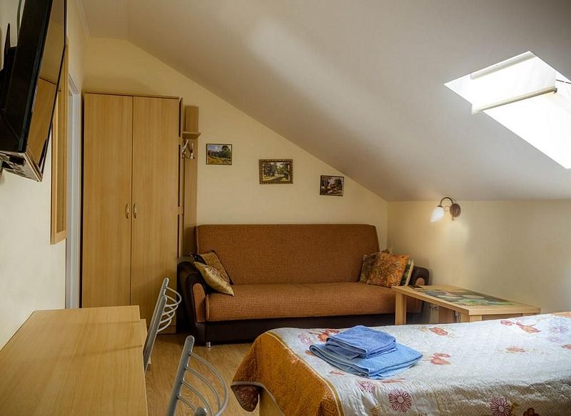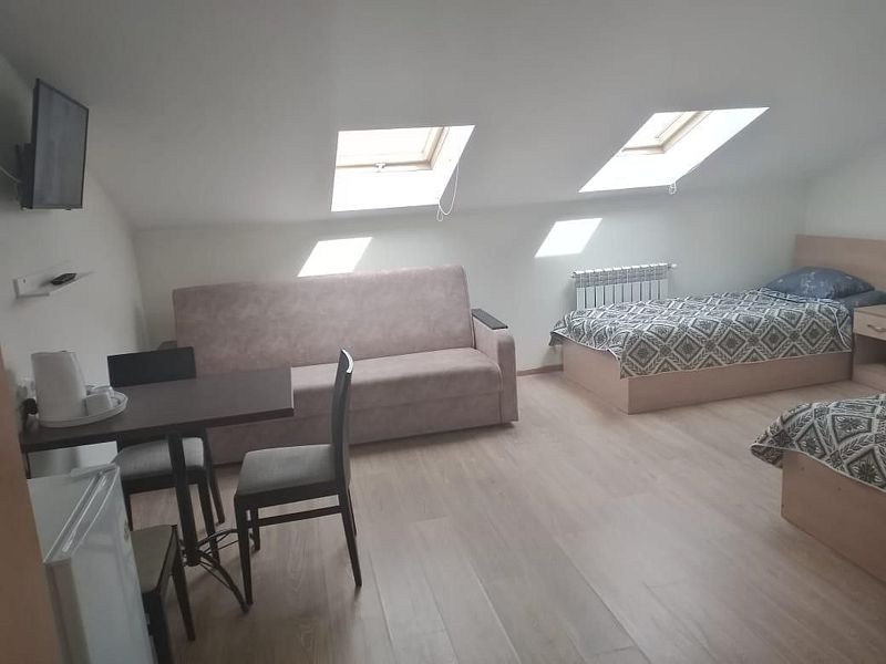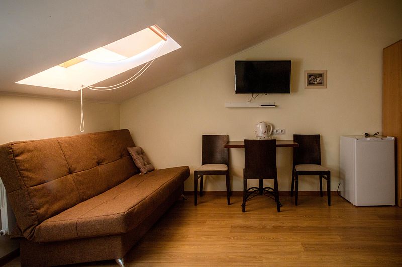 Четырехместная комната с 2 кроватями 90*200 и раскладывающимся диваном 130*190, находится на 2-м мансардном этаже.