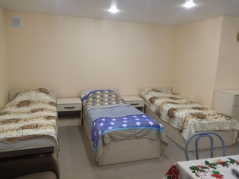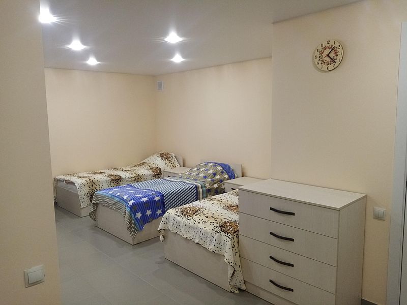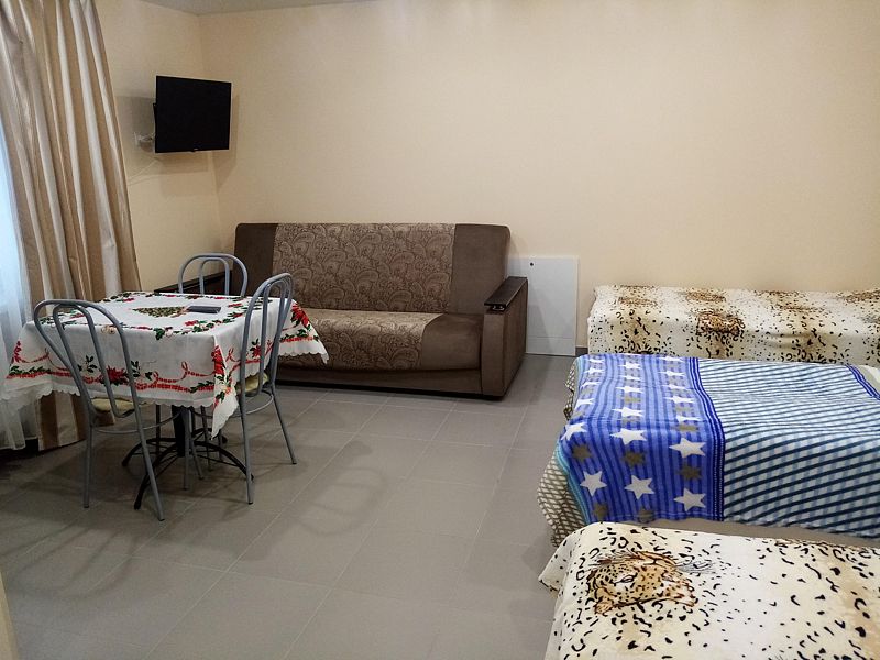 Пятиместная комната с тремя кроватями 90*200 и двуспальным раскладывающимся диваном 140*190. Комната находится на 1-м этаже в отдельном доме, расположенном в молодом яблоневом саду. Есть собственная зона на общей веранде для отдыха на свежем воздухе.