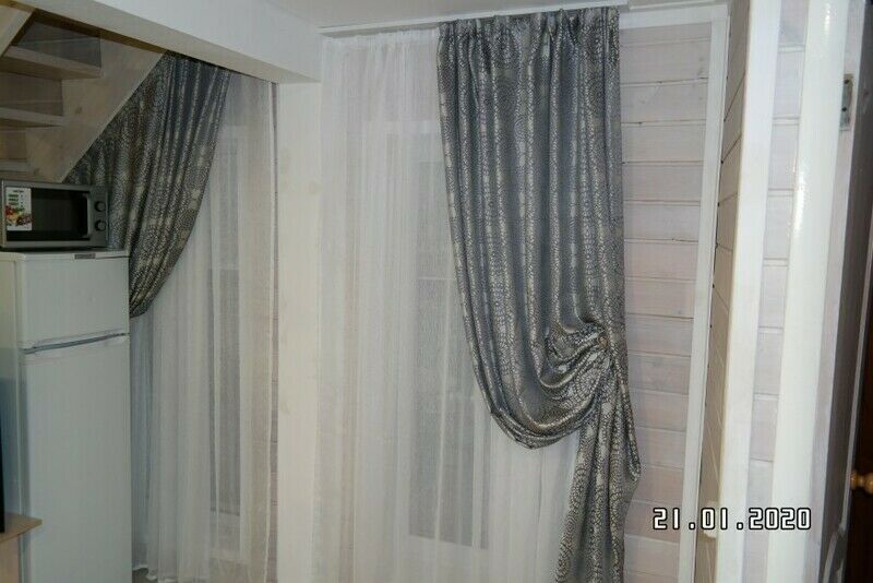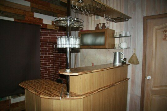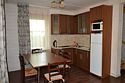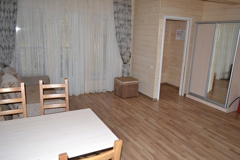 Гостевая совмещена с миникухней. На кухне имеются микроволновка, электрический чайник и холодильник. В гостевой располагаются диван, стол со стульями, телевизор со спутниковым телевидением. Спальня с двухспальной кроватью, гардеробом и трильяж. Санузел, душевая кабина, умывальник.