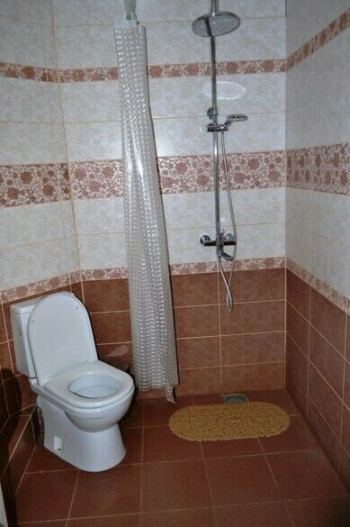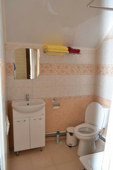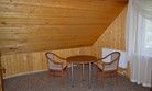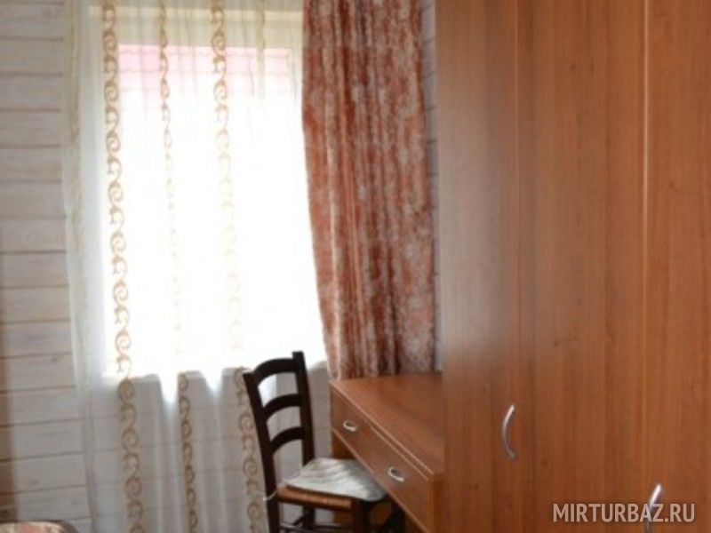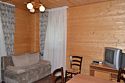 Первый этаж. Гостевая совмещена с миникухней. На кухне имеются микроволновка, электрический чайник и холодильник. В гостевой располагаются диван, стол со стульями, телевизорсо спутниковым телевидением. Спальня с двумя кроватями и гардеробом. Санузел, душевая кабина, умывальник.