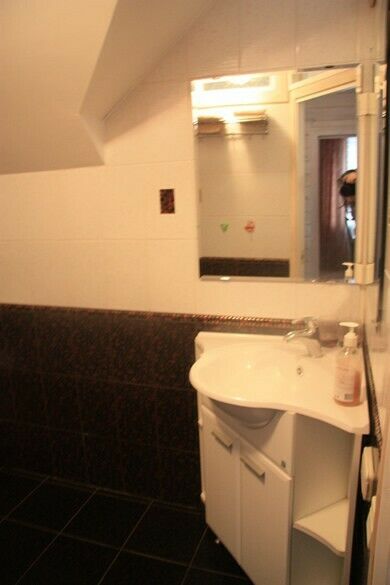 Второй этаж. Большая спальня с двухспальной кроватью, гардеробом и трельяжем. И еще одна спальня, две односпальные кровати и гардероб. Санузел, ванна, умывальник.