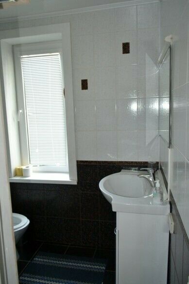 Первый этаж. Гостевая совмещена с кухней. На кухне имеются микроволновка, встроенная плита, электрический чайник и холодильник. В гостевой располагаются диван, стол со стульями, телевизорсо спутниковым телевидением. Две спальни с двумя кроватями и гардеробом. Санузел, душевая кабина, умывальник.