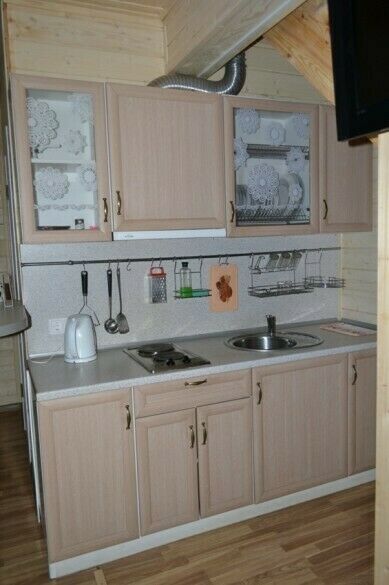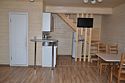 Первый этаж.Гостевая совмещена с кухней. На кухне имеются микроволновка, встроенная плита, электрический чайник и холодильник. В гостевой располагаются диван, стол со стульями, телевизор со спутниковым телевидением. Санузел, душевая кабина, умывальник.