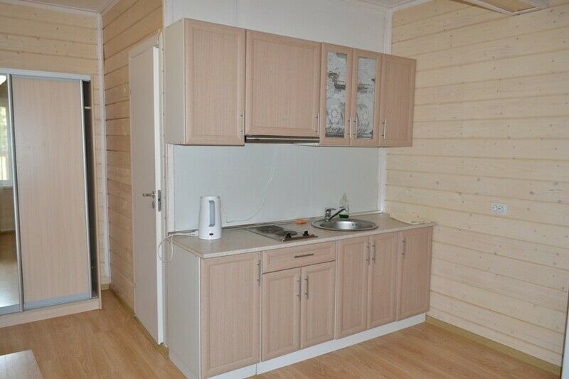 Первый этаж. Гостевая совмещена с кухней. На кухне имеются микроволновка, встроенная плита, электрический чайник и холодильник. В гостевой располагаются диван, стол со стульями, телевизор со спутниковым телевидением. Санузел, душевая кабина, умывальник.