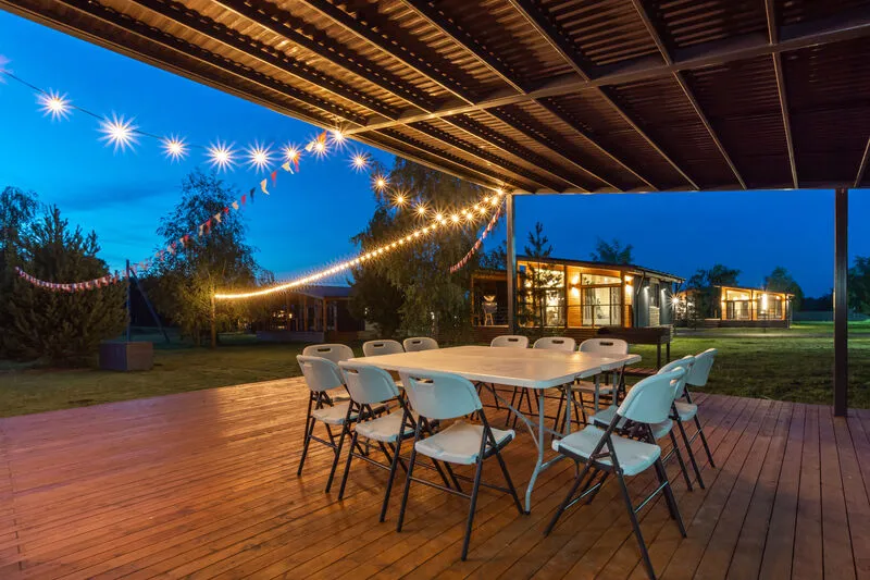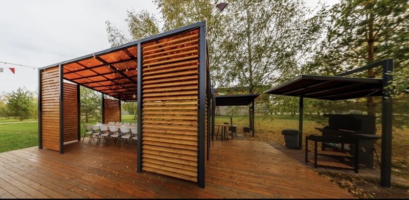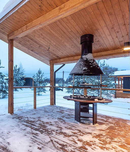 Терраса с барбекю-зоной, комод. Посуда: бокалы, штопор, сливки, соль, перец, масло, зубочистки. Принадлежности для гриля (шампура, решетка, розжиг, зажигалка). Средства личной гигиены (зубные щетки, шампунь, гель для душа).