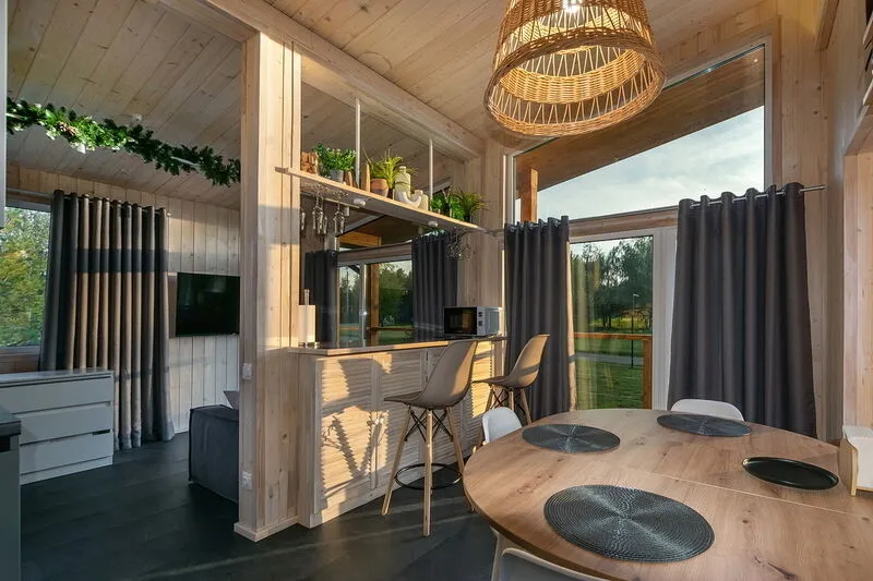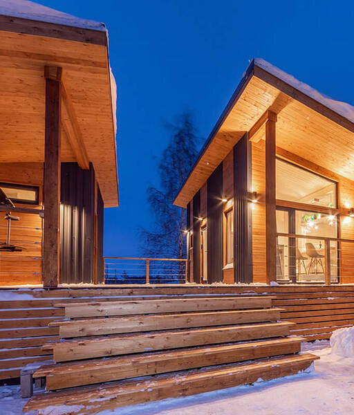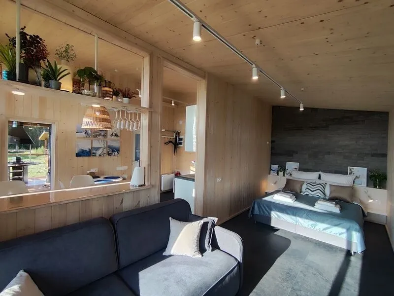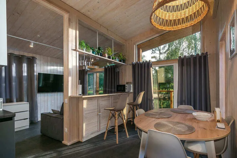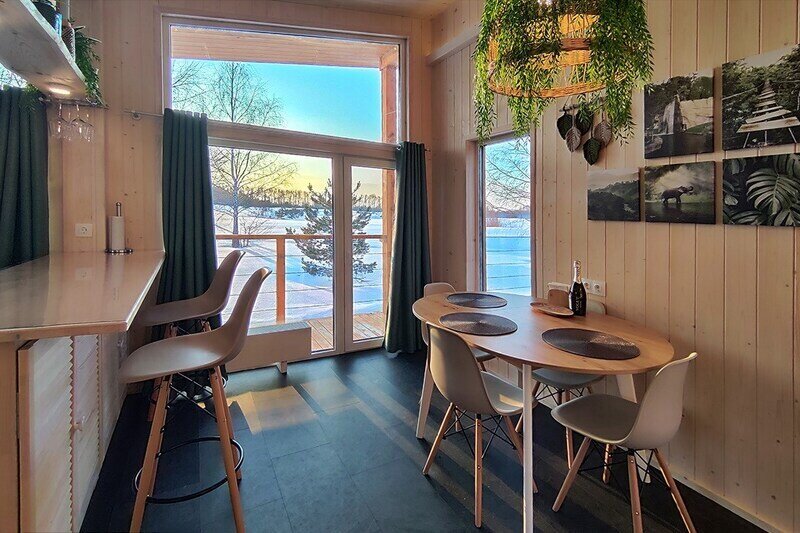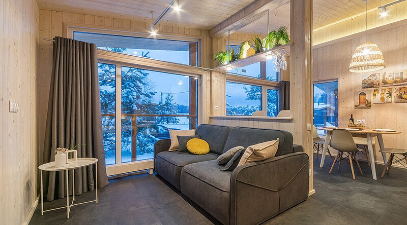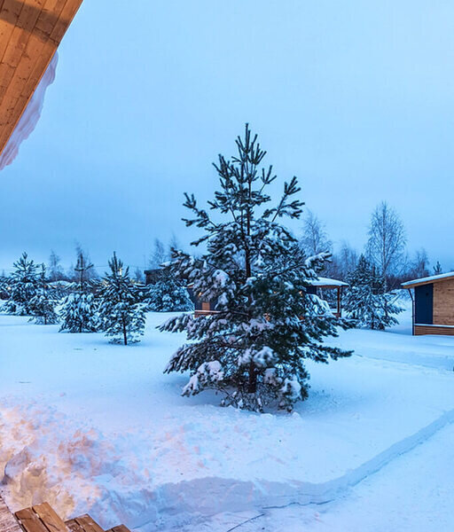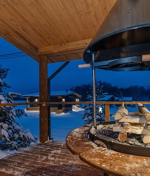 Здесь вы можете отдохнуть в комфортабельных коттеджах с панорамными окнами, рассчитанных на четырёх или шесть человек. В коттеджах есть санузел с душем и собственной сауной, кондиционер, телевизор и вся необходимая мебель. Также работает Wi-Fi.