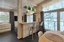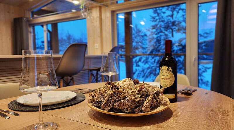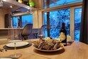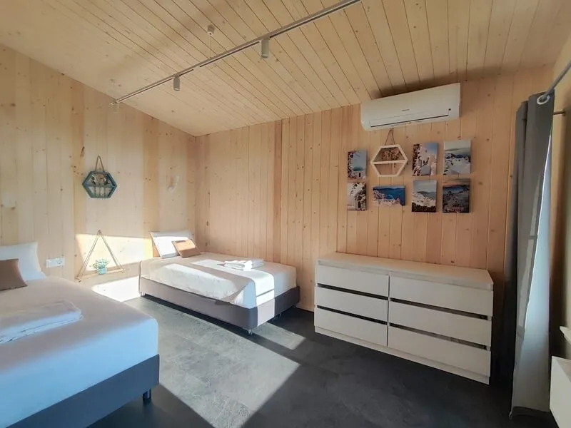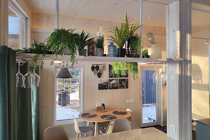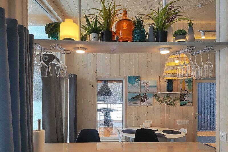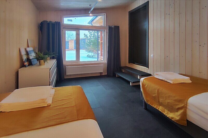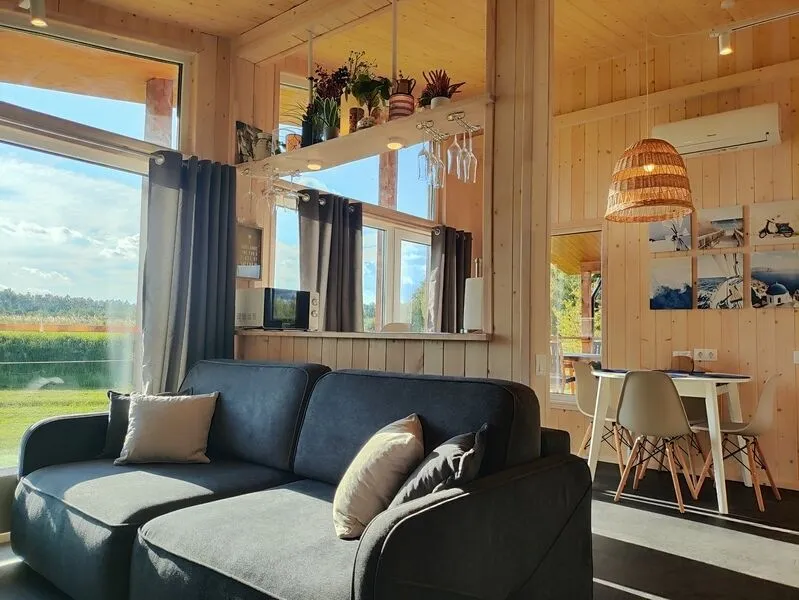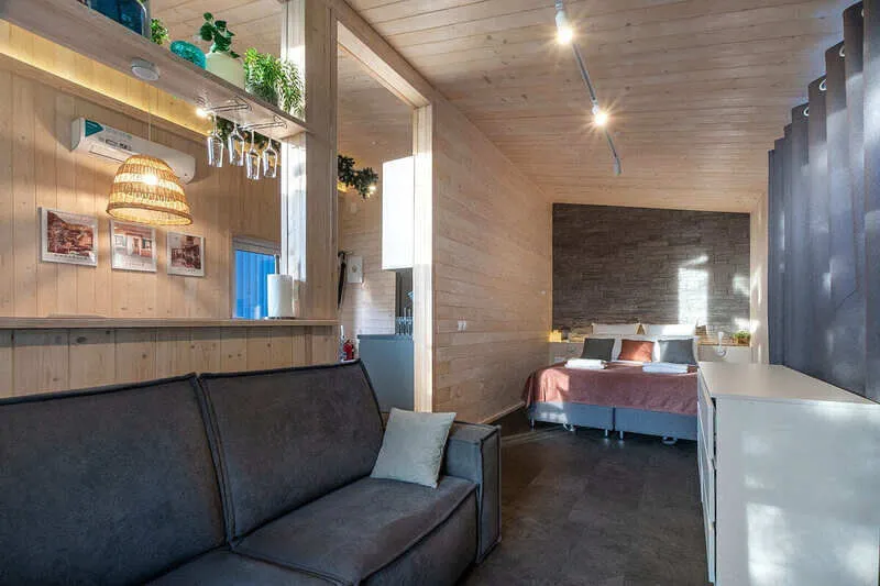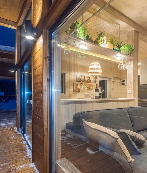 Здесь вы можете отдохнуть в комфортабельных коттеджах с панорамными окнами, рассчитанных на четырёх или шесть человек. В коттеджах есть санузел с душем и собственной сауной, кондиционер, телевизор и вся необходимая мебель. Также работает Wi-Fi.