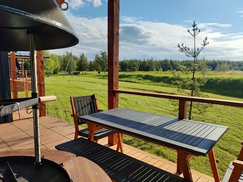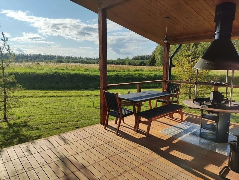 На террасе уличный стол с двумя креслами и скамейкой, финский дровяной гриль с шампурами и решеткой. В сауне комфортное место для переодевания и душевая кабина, парильное отделение с электрокаменкой НАRVIA.
