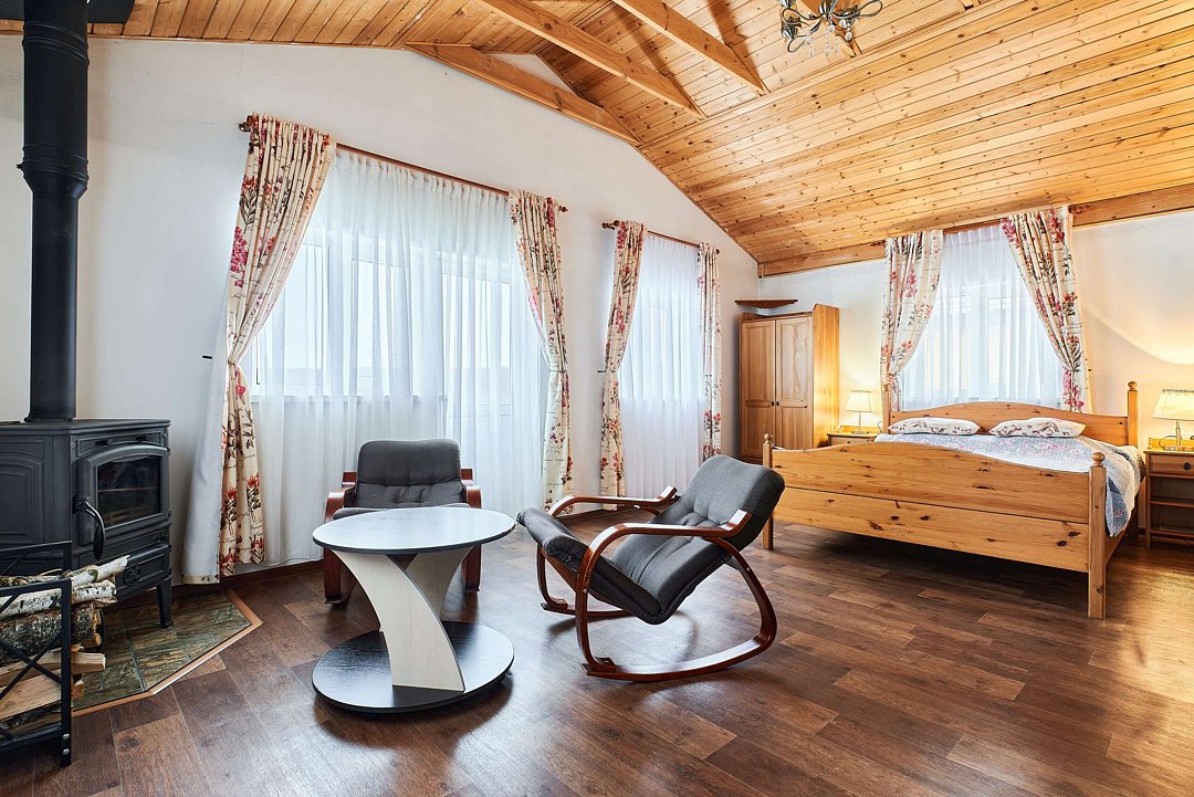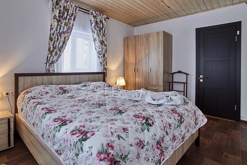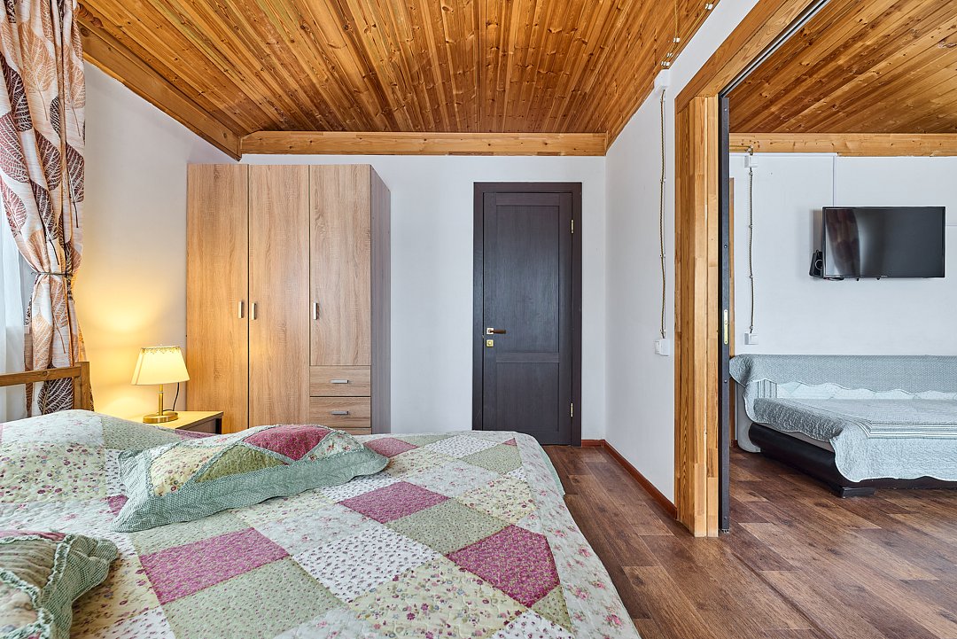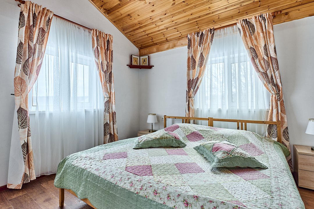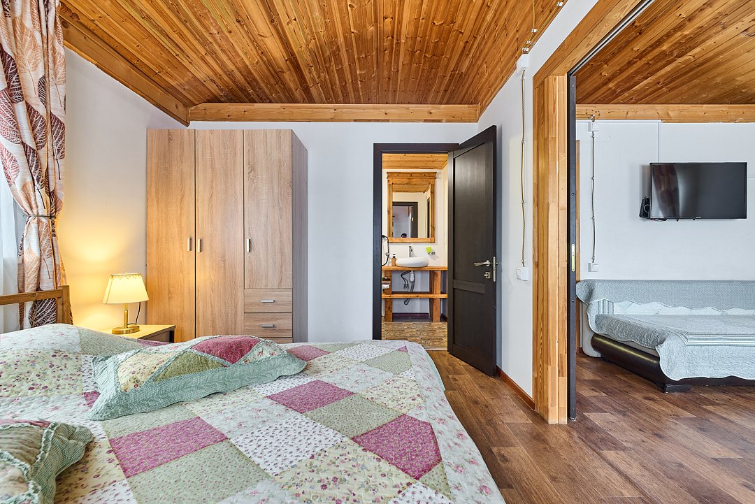 - Двуспальная кровать «king-size» под высокими двускатными потолками