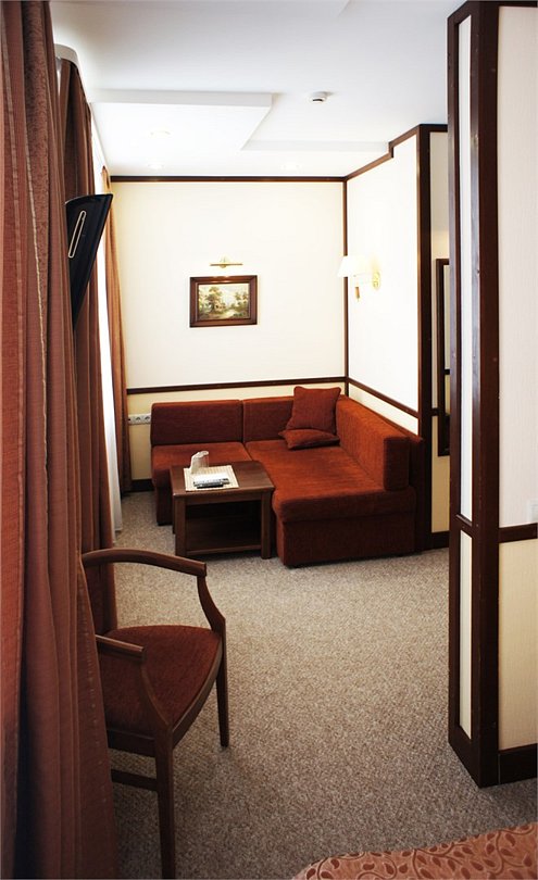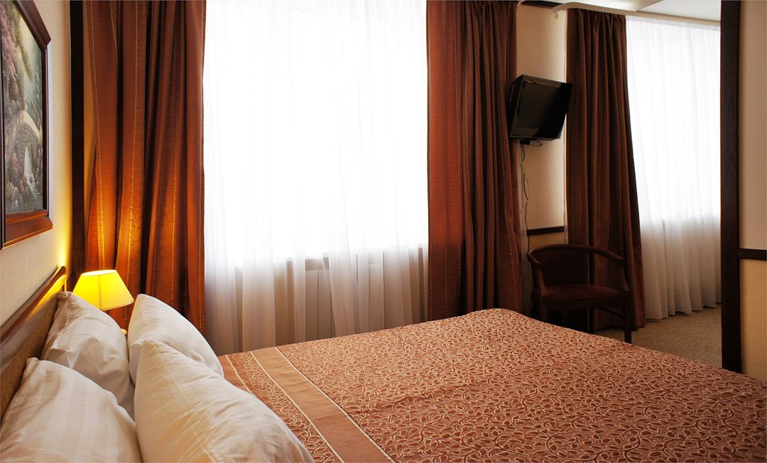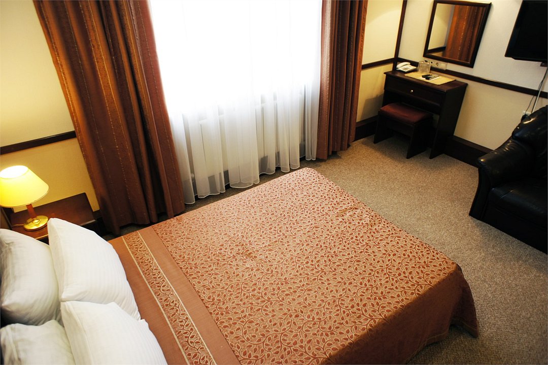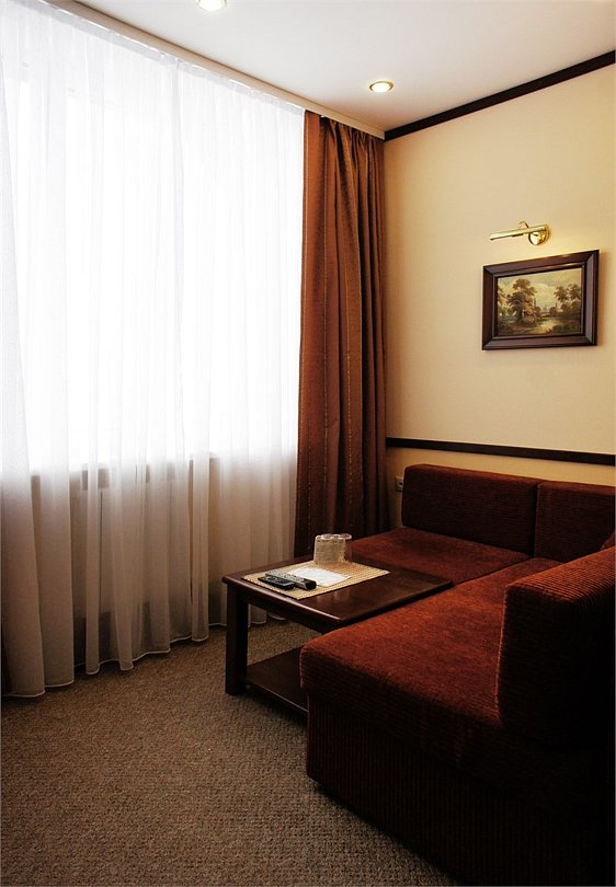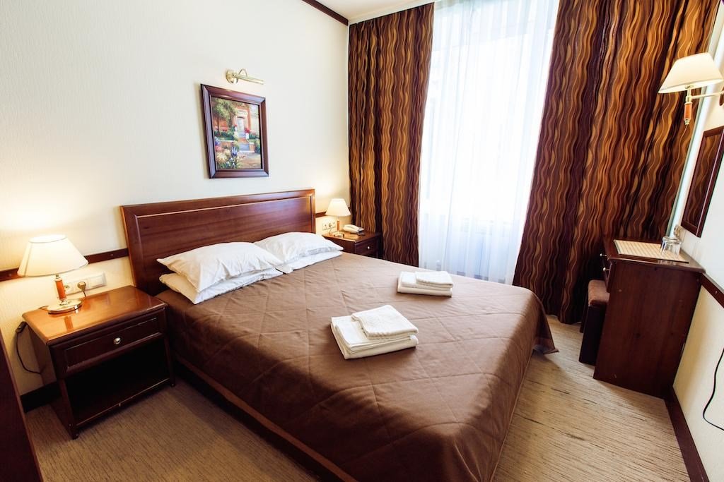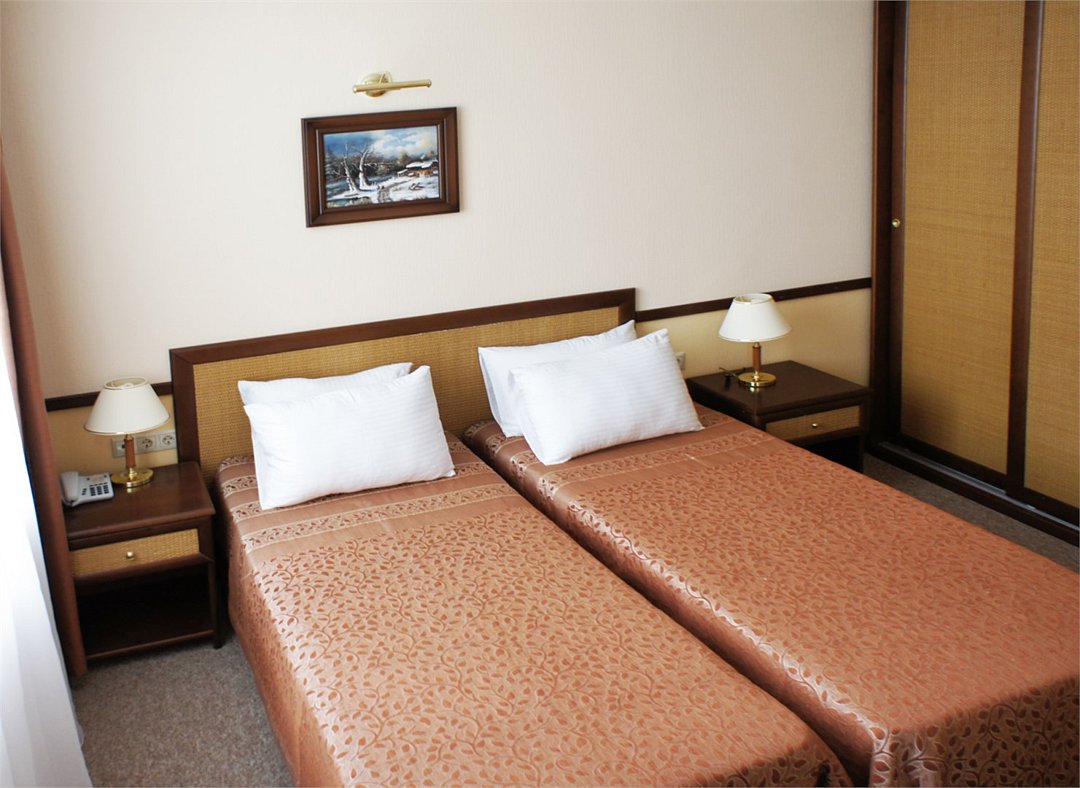 Номер «Комфорт» превосходный вариант для почитателей классических, строго выдержанных интерьеров. Номер включает в себя одну зонированную комнату общей площадью 22 м2, в которой могут расположиться до 3 человек. Здесь имеется небольшая зона отдыха с мягким диванчиком и журнальным столиком. Удобные кровати с ортопедическими матрацами позволят Вам комфортно выспаться. К Вашим услугам вместительный шкаф-купе, холодильник, телефон, телевизор, сейф. В ванной комнате, оснащенной душевой кабиной, раковиной, с/узлом, Вам бесплатно предоставлены средства личной гигиены. Гости номера "Комфорт" получают Wifi интернет в общественных зонах, бесплатную парковку.Услуги и удобства