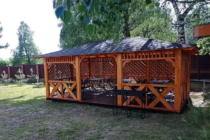 Для гостей мини-отеля, предназначена для отдыха и релаксации, оснащена костровыми чашами и большими аутентичными лавками из дерева.