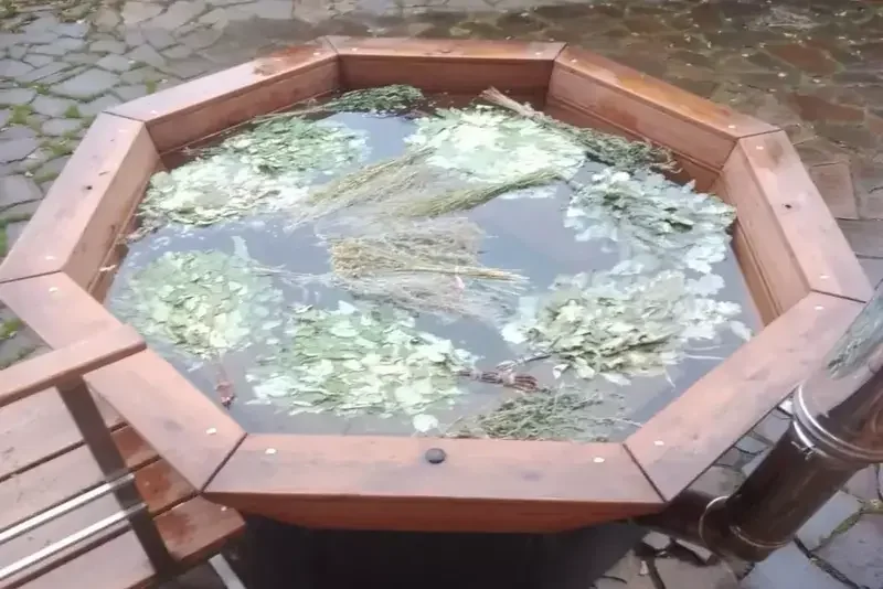 - банный чан из нержавеющей стали, отделанный лиственницей высшего сорта, доступен с травами или без. Подходит для взрослых и детей, дарит здоровье и удовольствие;