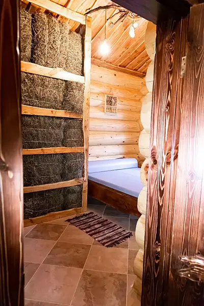 - сенная комната для отдыха со стеной из сена и луговых трав.