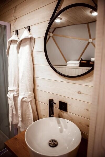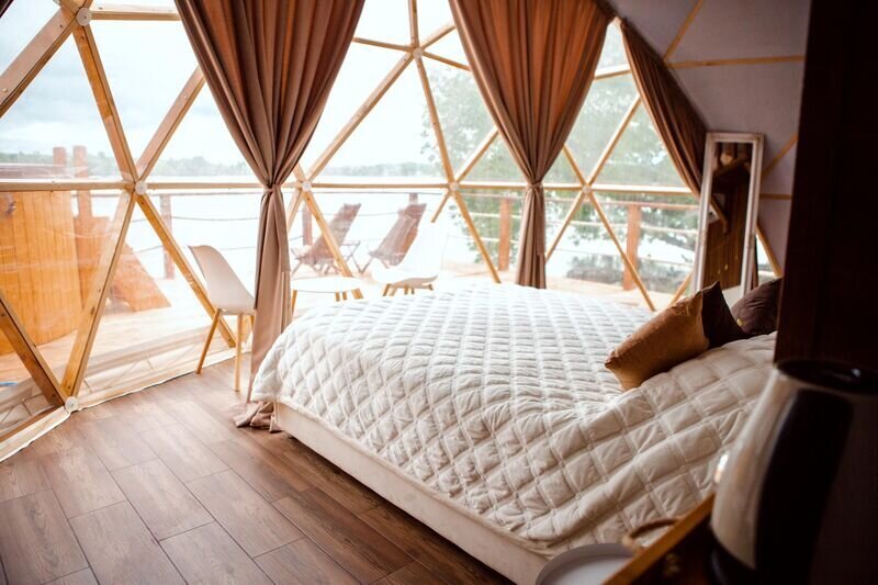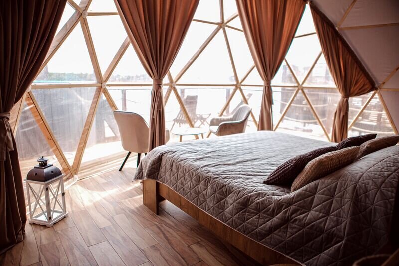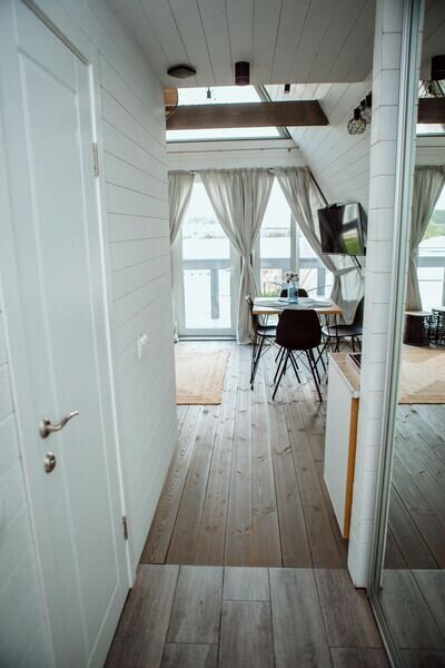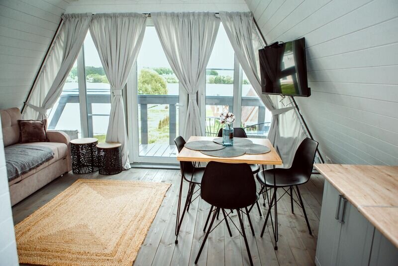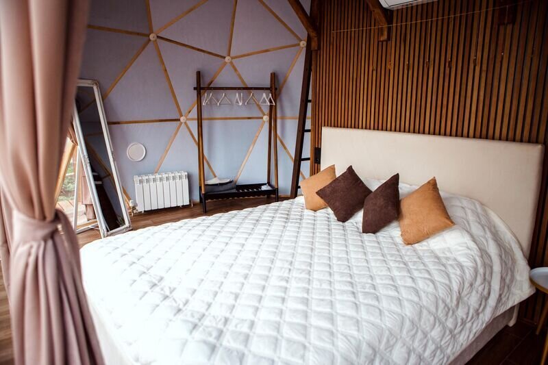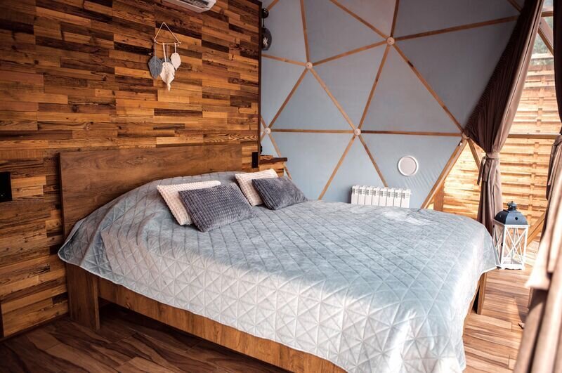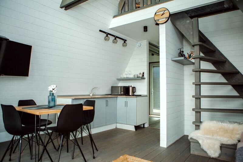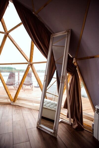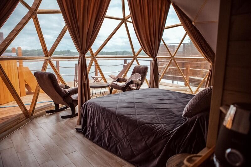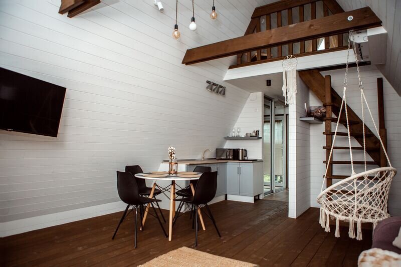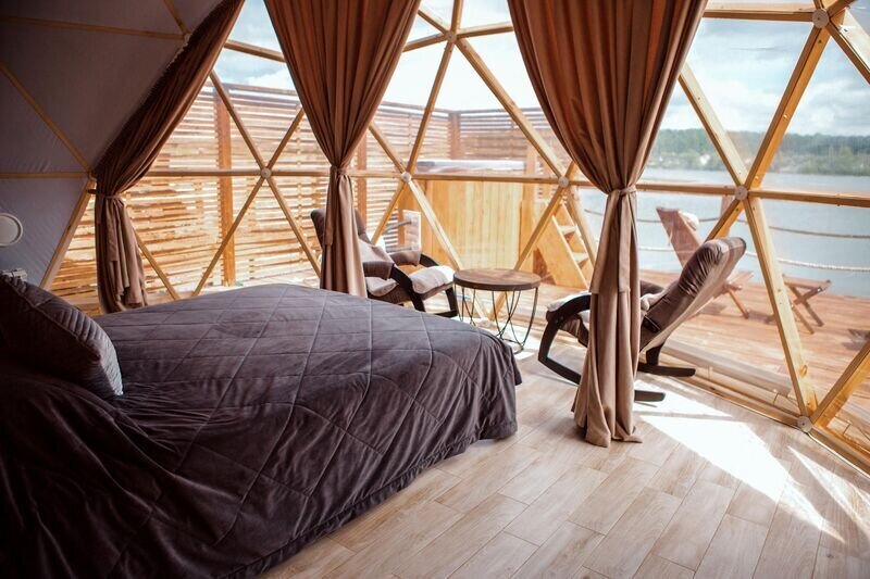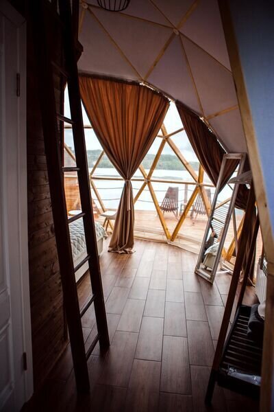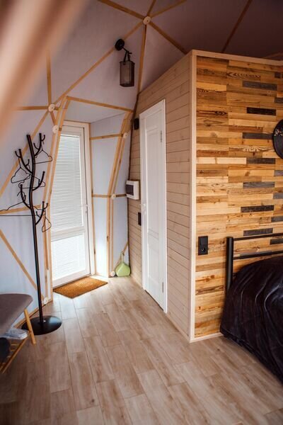 Интерьер сферы — свежий, чистый и простой, лишенный декоративных излишеств и оформленный в скандинавском стиле, благодаря чему выглядит современно и стильно. Сочетание натуральных материалов, пастельных тонов и деревянных элементов создает уют в домике. Помещение функционально оборудовано для полноценного отдыха.