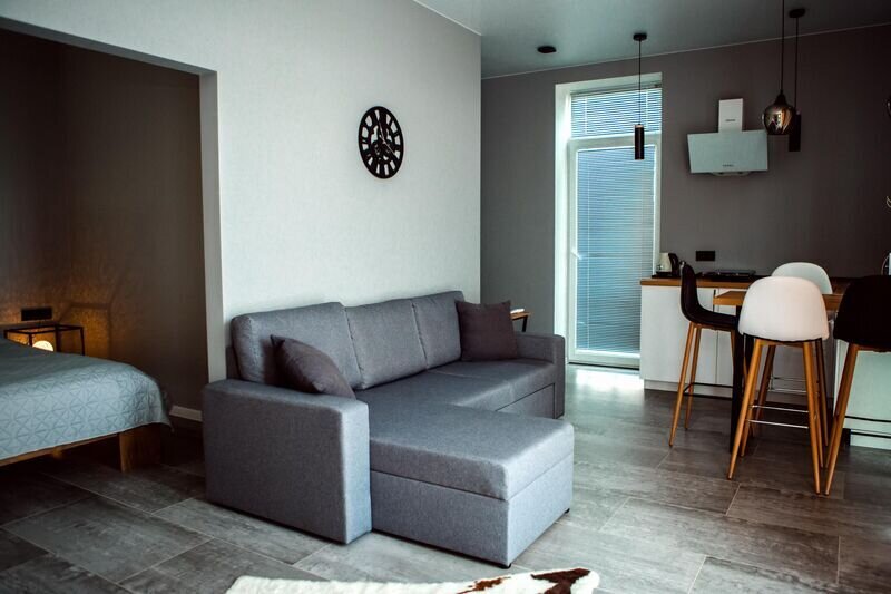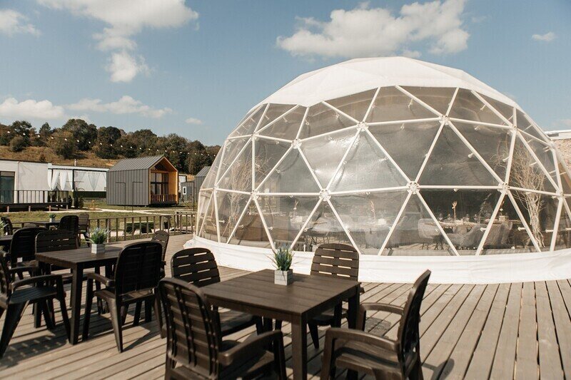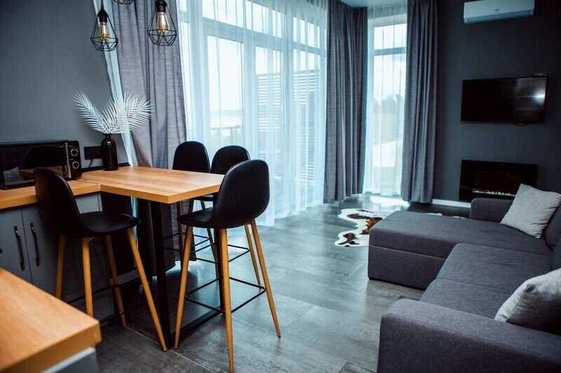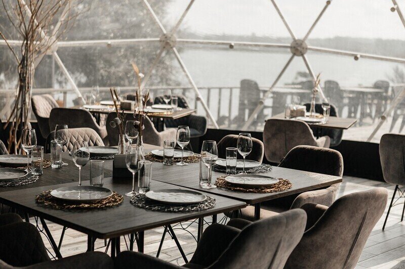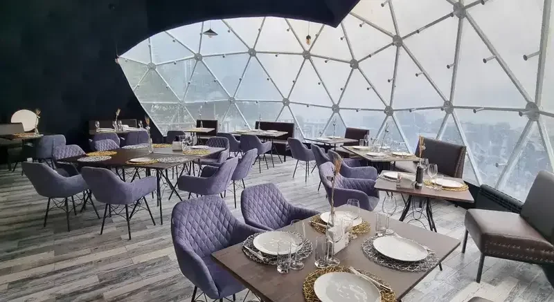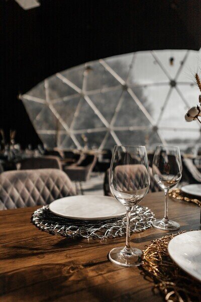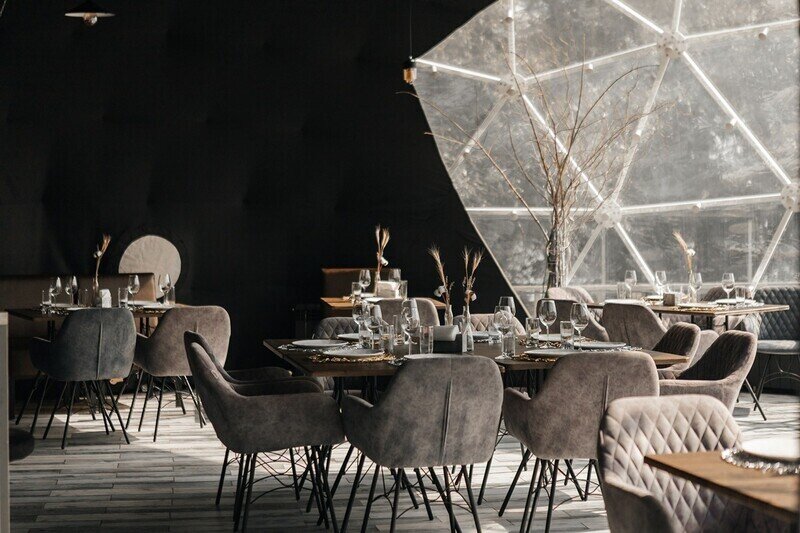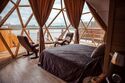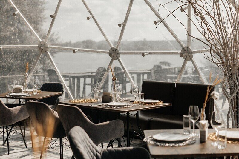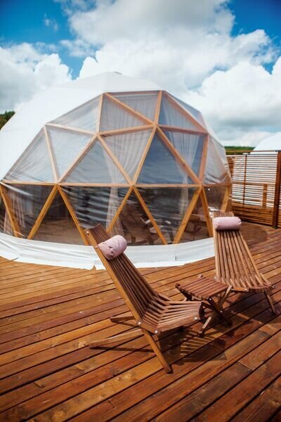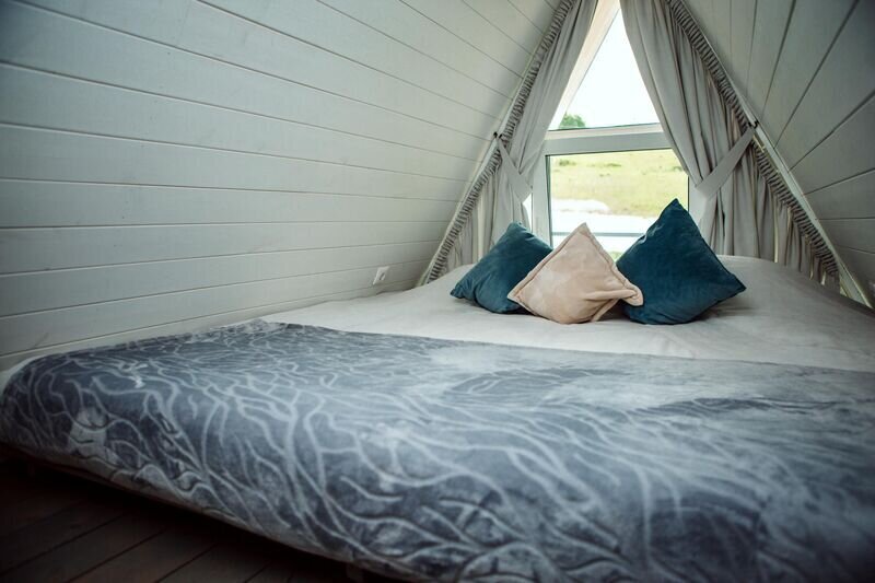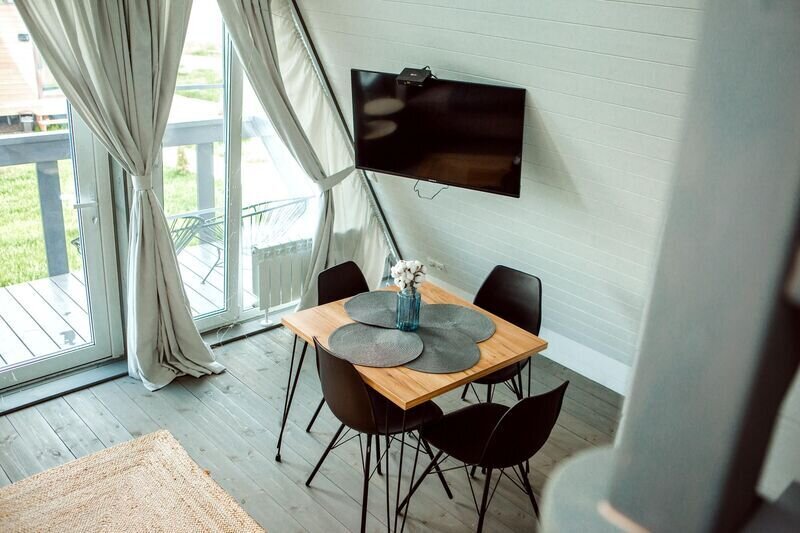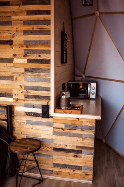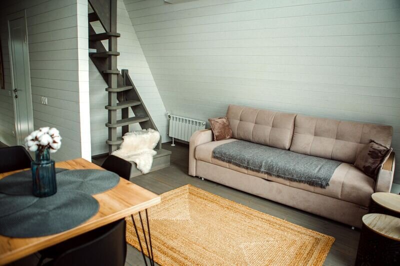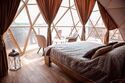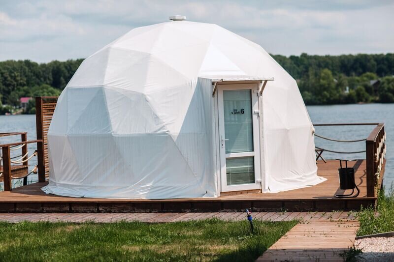 Интерьер сферы — свежий, чистый и простой, лишенный декоративных излишеств и оформленный в скандинавском стиле, благодаря чему выглядит современно и стильно. Сочетание натуральных материалов, пастельных тонов и деревянных элементов создает уют в домике. Помещение функционально оборудовано для полноценного отдыха.