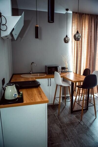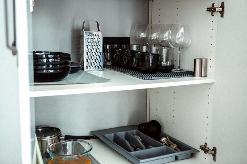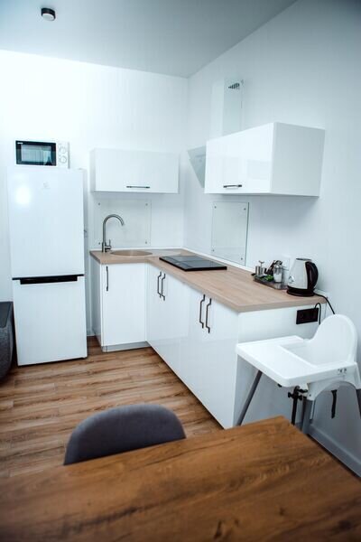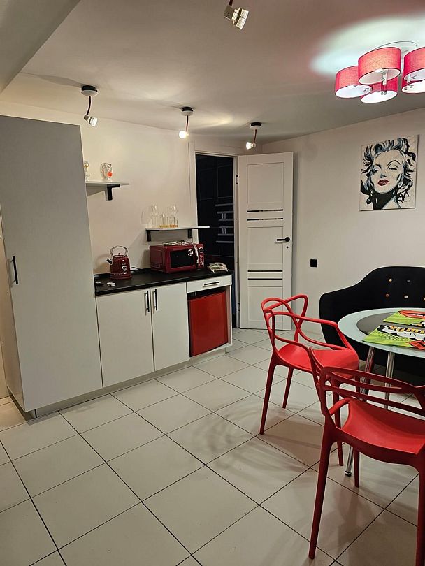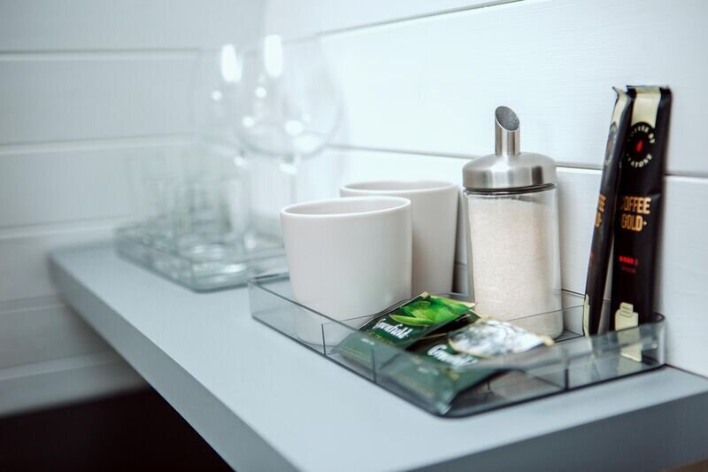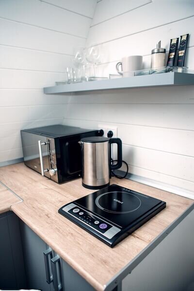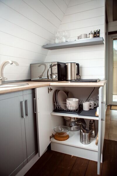 - мини-кухня (микроволновка, холодильник, чайник, посуда для приготовления и сервировки);