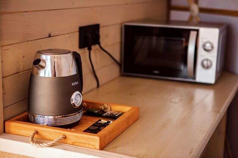 Вы можете не отказываться от Ваших привычек по части домашней еды и привезти все необходимые продукты с собой — в каждом домике есть мини-кухня. Это грамотно подобранный набор всего необходимого для приготовления пищи и сервировки блюд. В сферах мини-кухонь нет, но оборудованы чайные уголки, где предусмотрены чайник, микроволновая печь, холодильник.