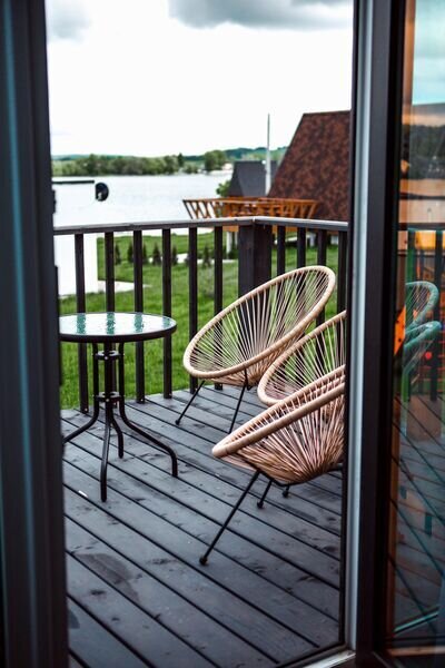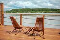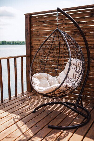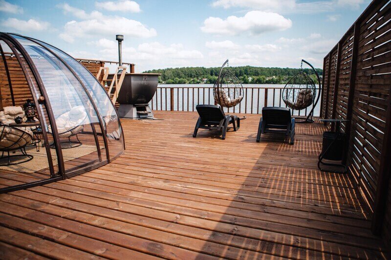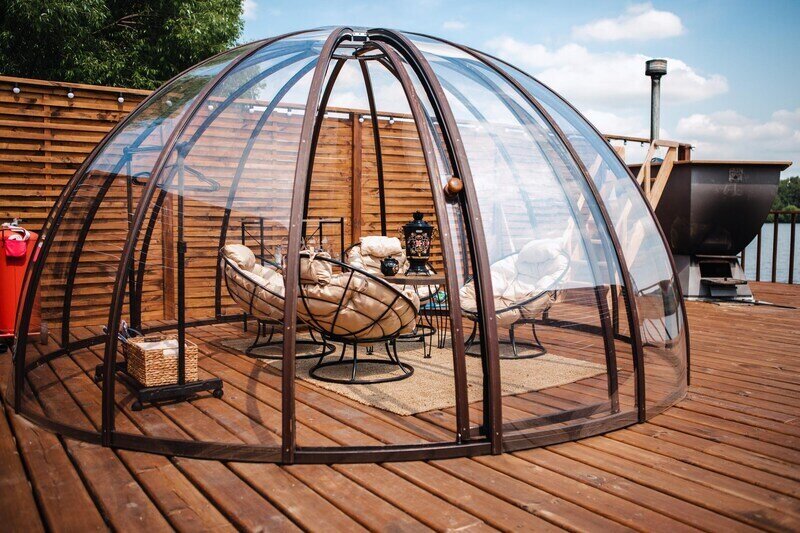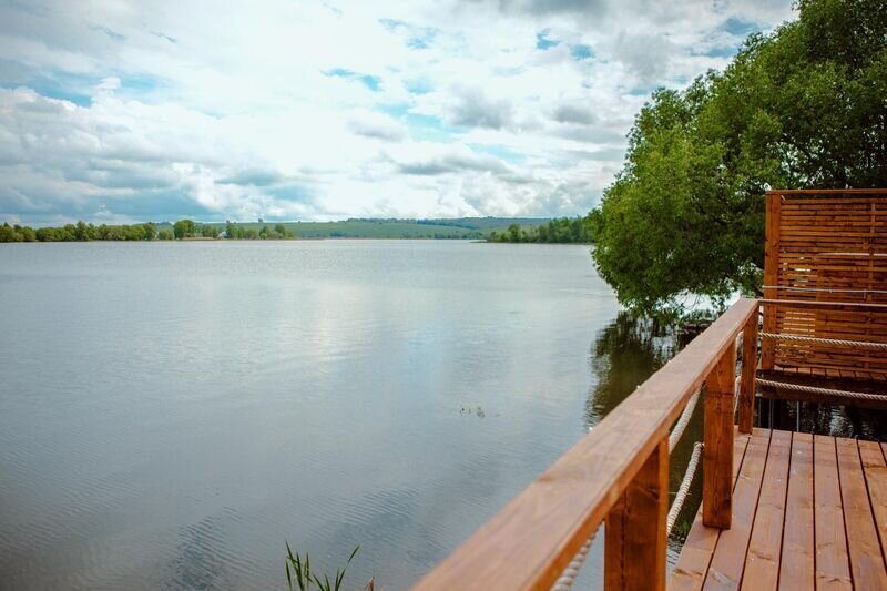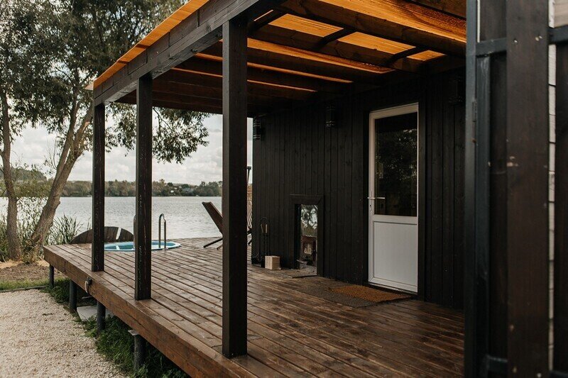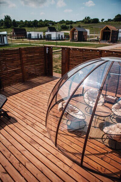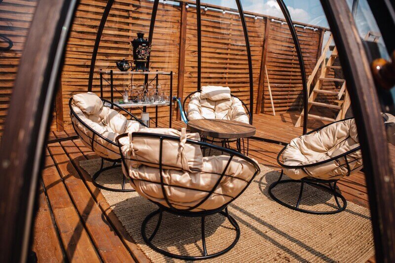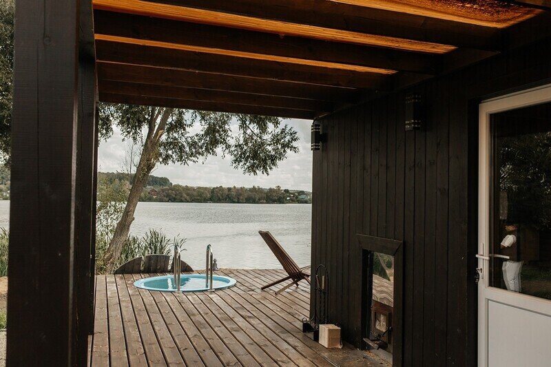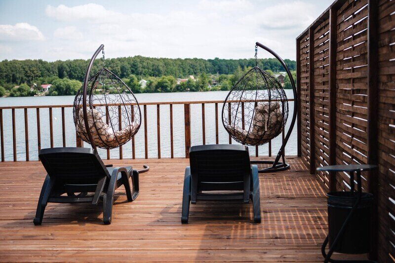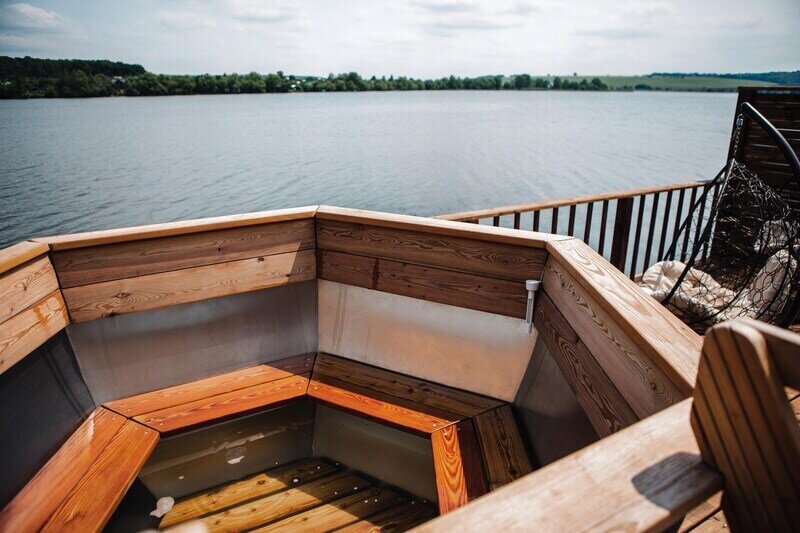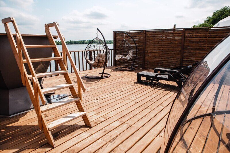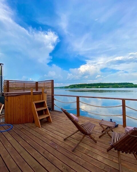 Территория окружена достаточно высоким ограждением, выполненным из натурального дерева, что создает ощущение уединения и спокойствия. Четвертая сторона, обращенная к воде, имеет сквозное ограждение, обеспечивая безопасность отдыха с детьми. Здесь также доступен горячий банный чан на дровах и удобная чайная зона под куполом со всей необходимой посудой, а также шезлонги и качели для отдыха на свежем воздухе.