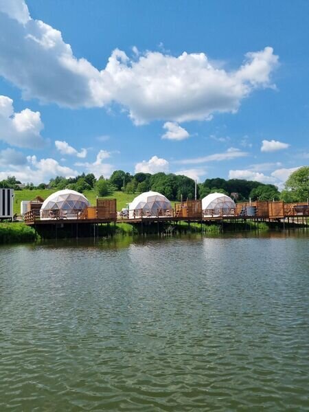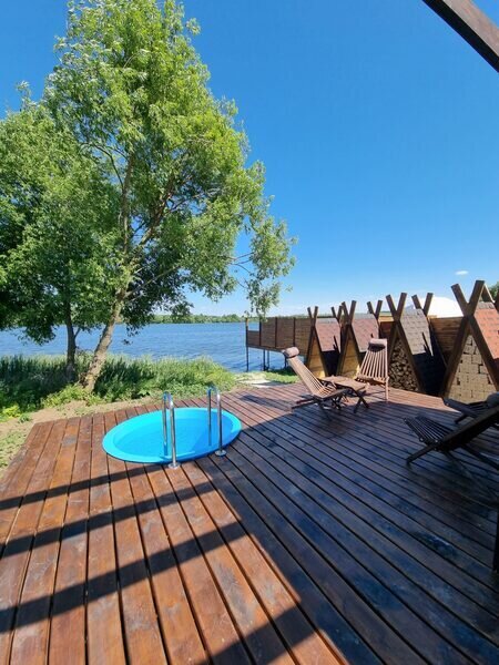 Читать полностьюТерритория окружена достаточно высоким ограждением, выполненным из натурального дерева, что создает ощущение уединения и спокойствия. Четвертая сторона, обращенная к воде, имеет сквозное ограждение, обеспечивая безопасность отдыха с детьми. Здесь также доступен горячий банный чан на дровах и удобная чайная зона под куполом со всей необходимой посудой, а также шезлонги и качели для отдыха на свежем воздухе.