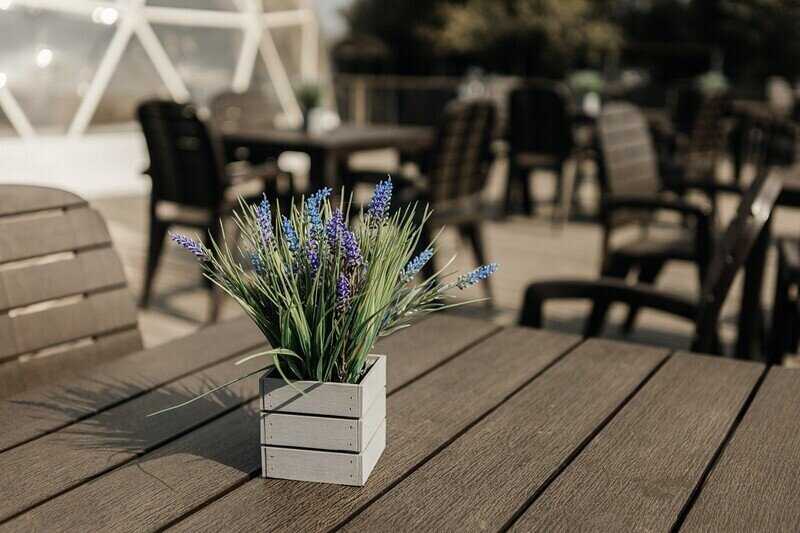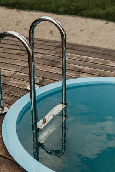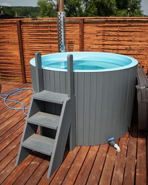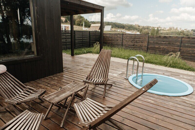На территории банного комплекса «Жара» находится купель с холодной водой, рядом с которой расположены шезлонги и столик.