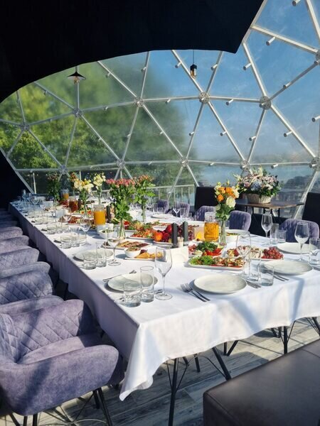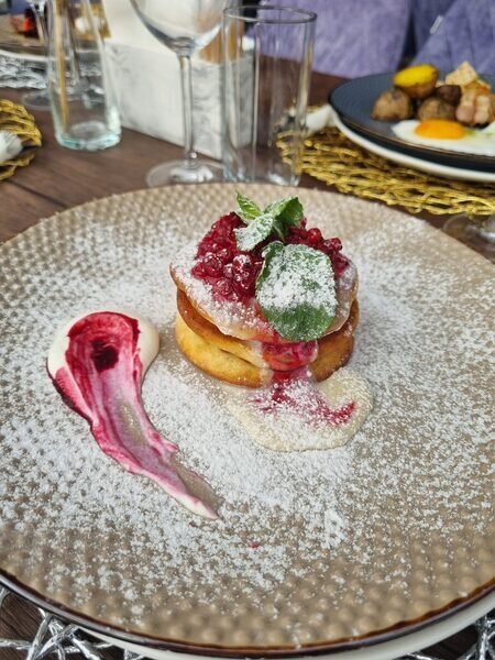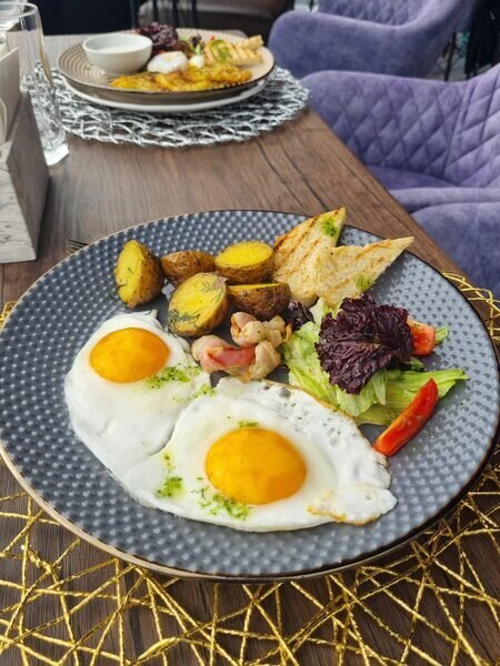 Гостям предлагаются комплексные завтраки, которые можно сразу заказать при заселении на ресепшн или просто придя в ресторан. Стоимость 330 ₽/блюдо на выбор и напиток. При выборе тарифа с питанием на двоих, завтрак входит в стоимость проживания.