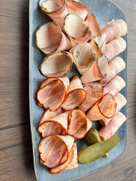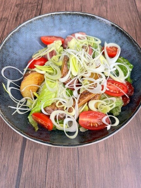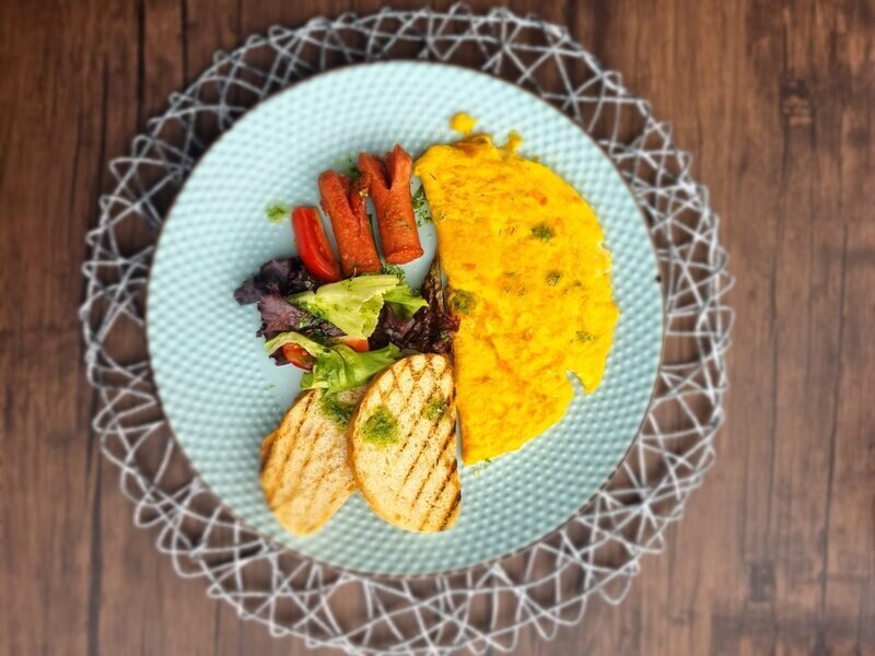 - Баварский завтрак (омлет с сыром, колбаска, тост, салат);