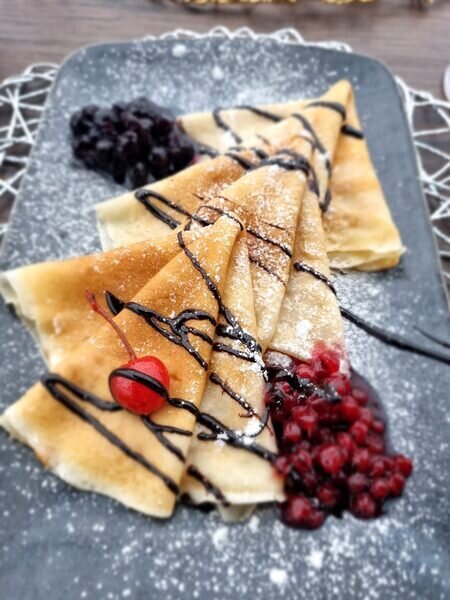 - Блинчики (блинчики, джем, сгущённое молоко, сметана).