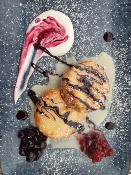 - Сырники творожные (сырники, джем, сгущённое молоко);