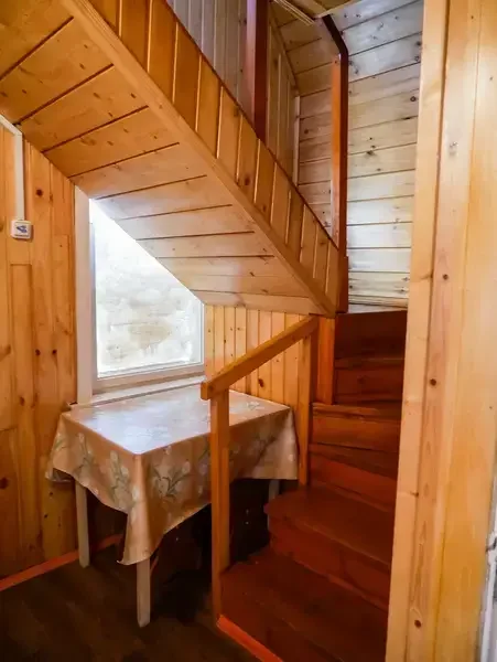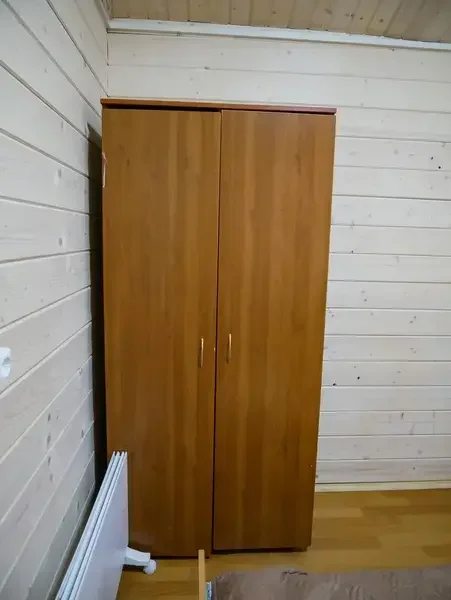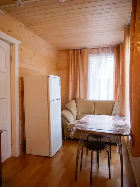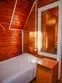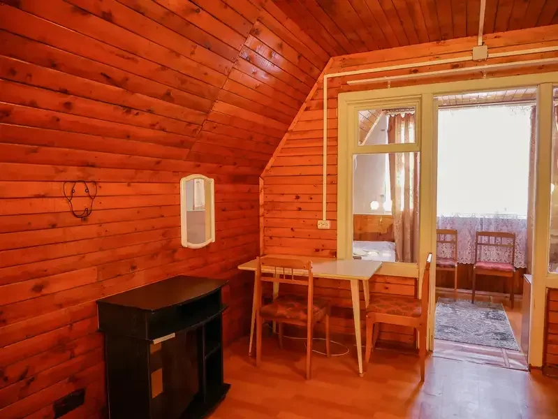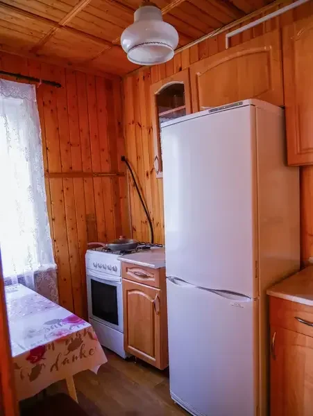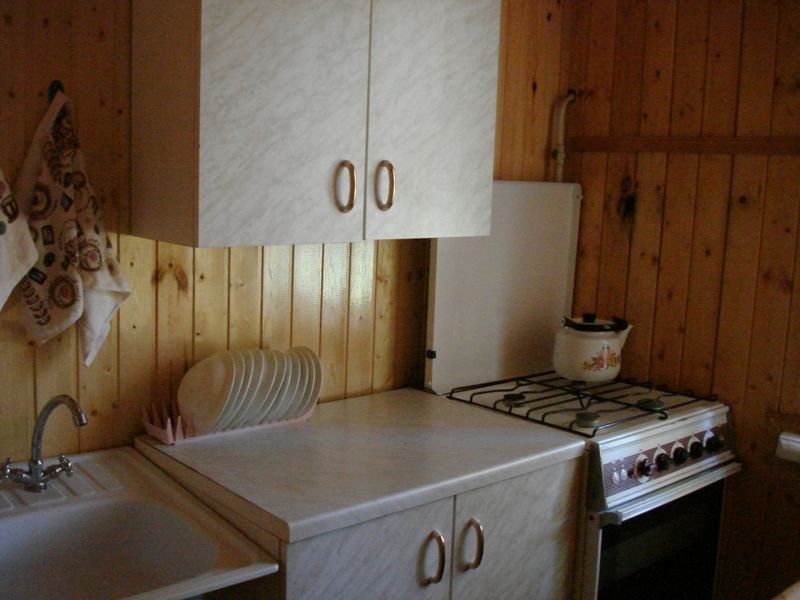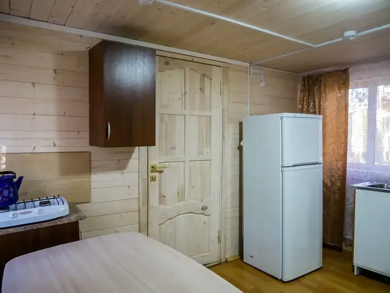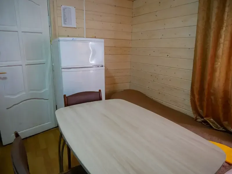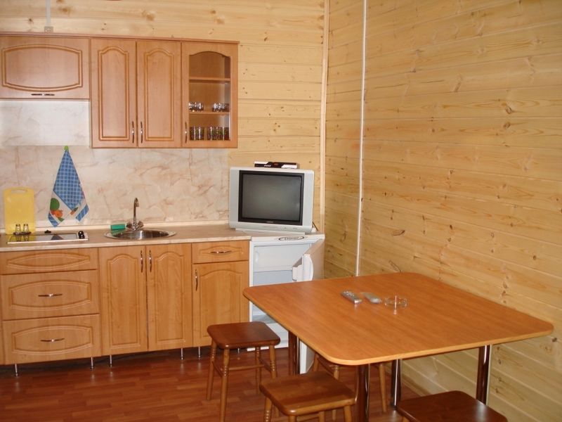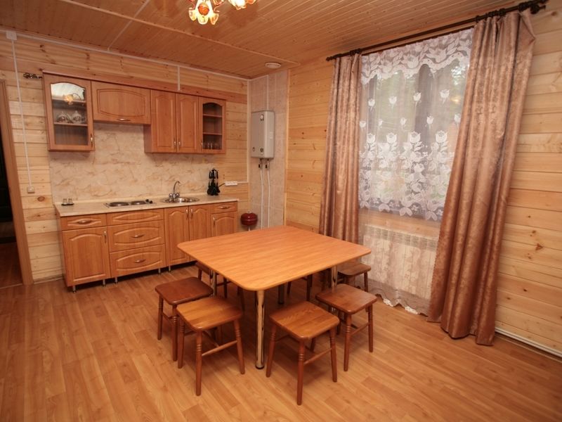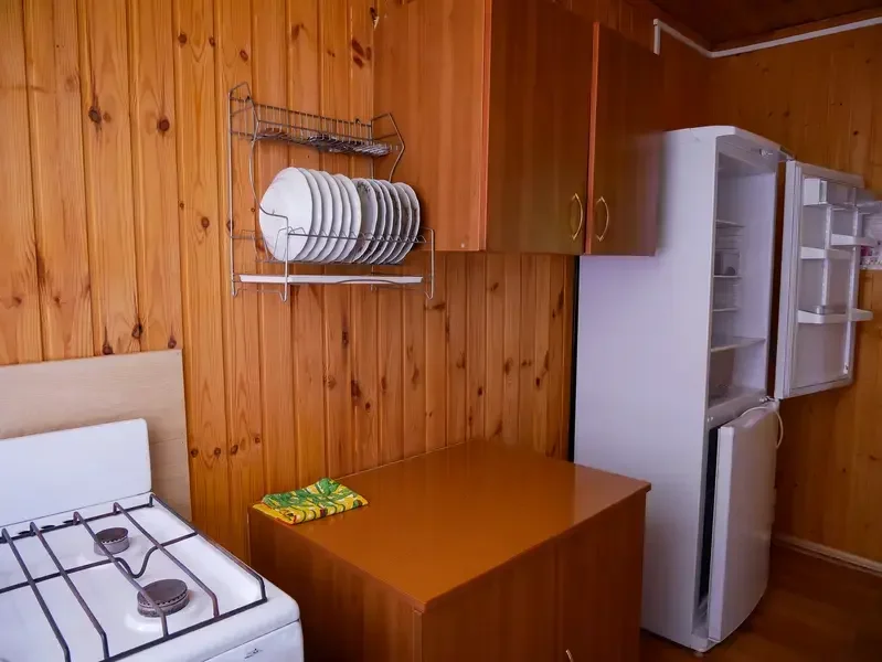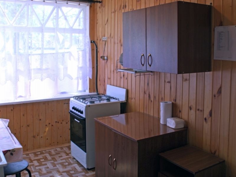Внутри: веранда, 2 спальные комнаты, в которых по 2 односпальные кровати, прикроватные тумбы, двустворчатый шкаф, 4 комплекта постельного белья; кухня, в которой располагаются кухонный стол со стульями, холодильник, газовая плита, раковина, кухонный гарнитур с необходимым набором посуды, рассчитанным на 4 персоны (столовые приборы, глубокие и мелкие тарелки, стаканы, бокалы), набором посуды для приготовления пищи (набор кастрюль, сковорода, чайник, кухонный нож, разделочная доска) и другой кухонной утварью. Санузел оборудован душем (холодная и горячая вода), унитазом, а так же аксессуарами для ванной комнаты, полотенцами и необходимыми предметами для уборки помещения.