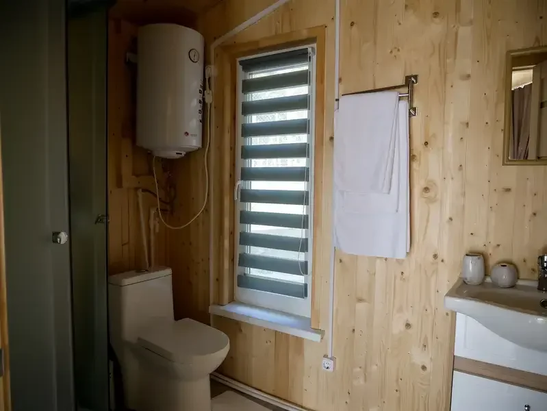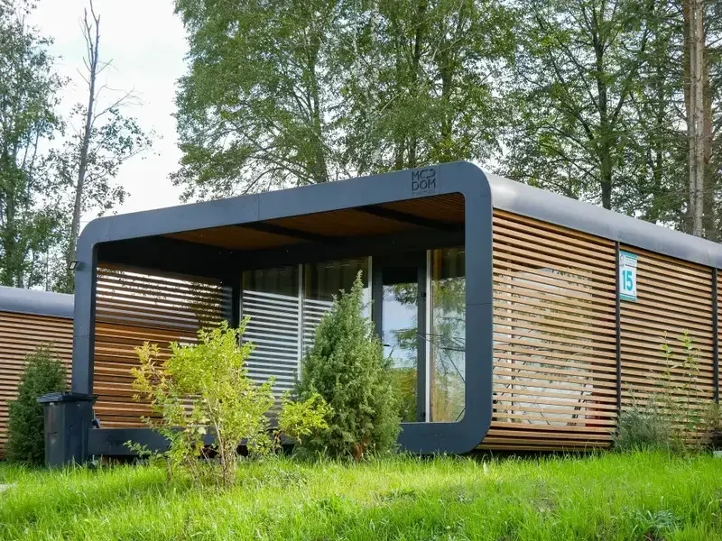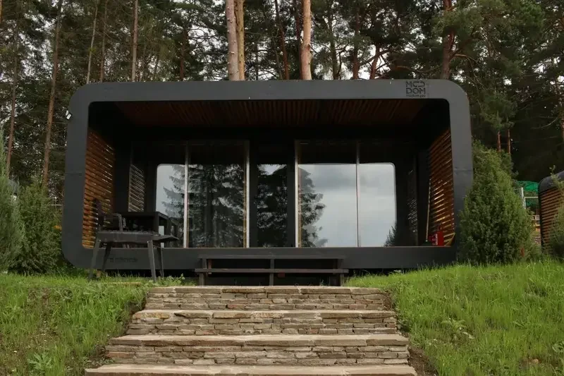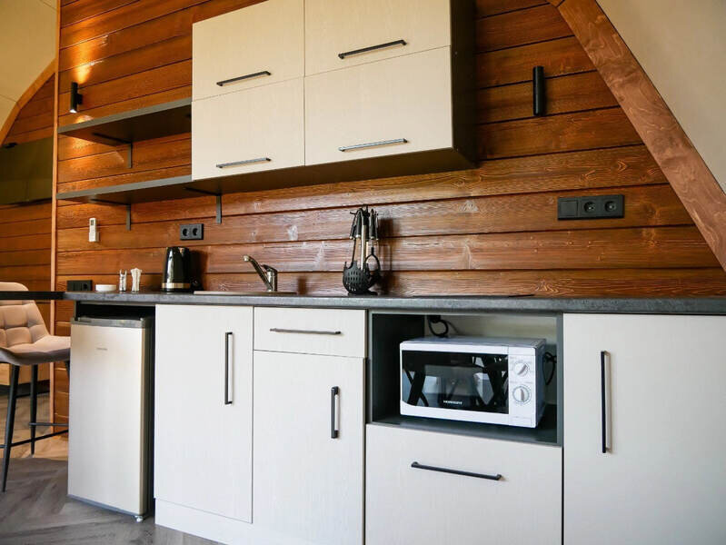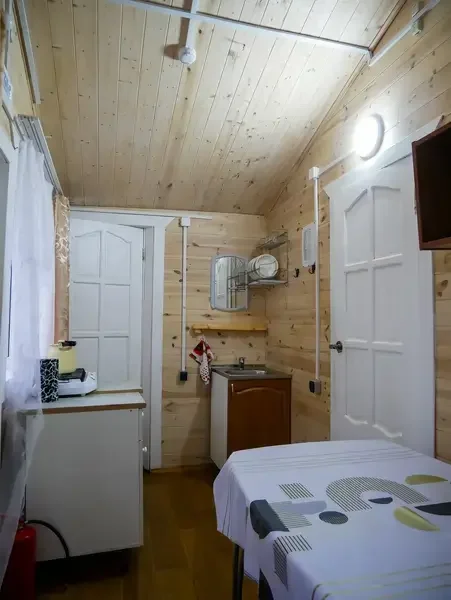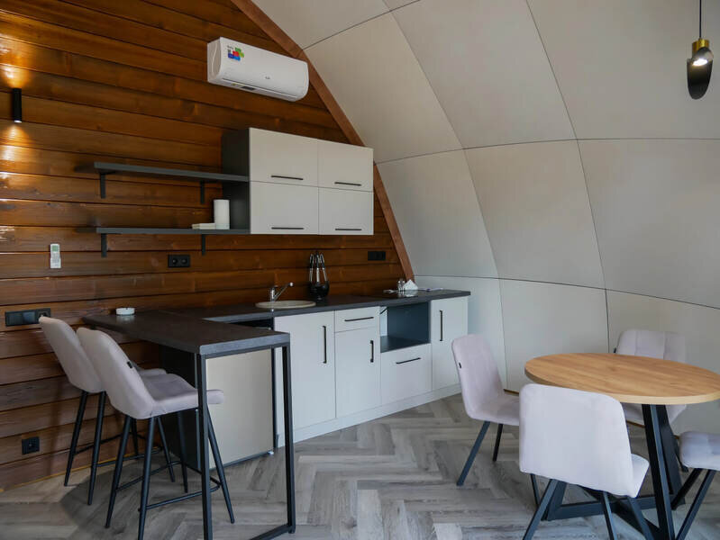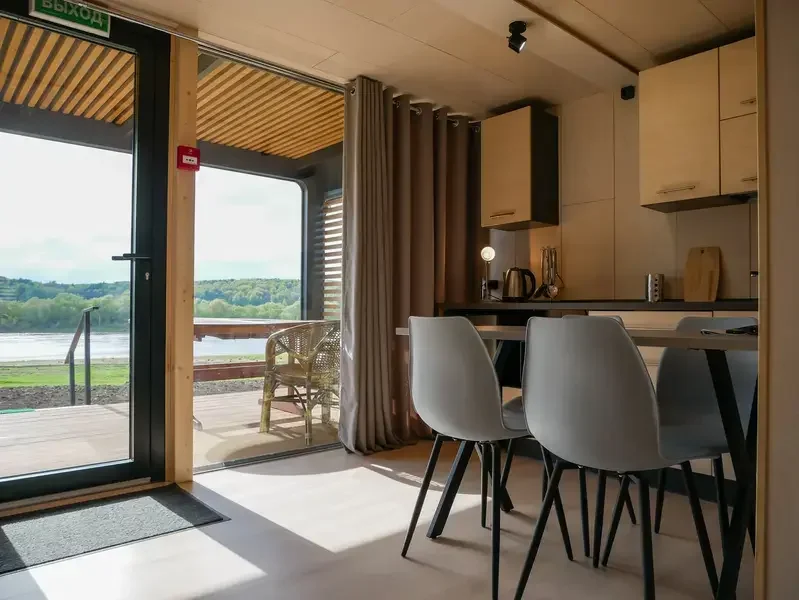 Современный комфортабельный модульный дом-студия с полностью оборудованной кухней, обеденной зоной и панорамными окнами. В доме есть двуспальная кровать и раскладывающийся диван. Санузел с водонагревателем, фен.