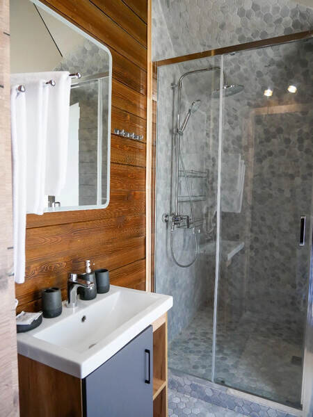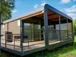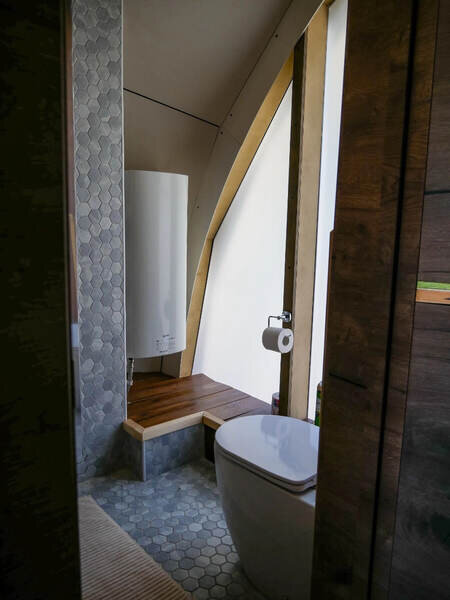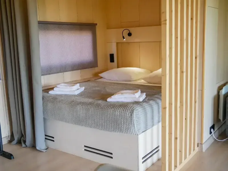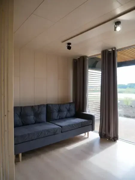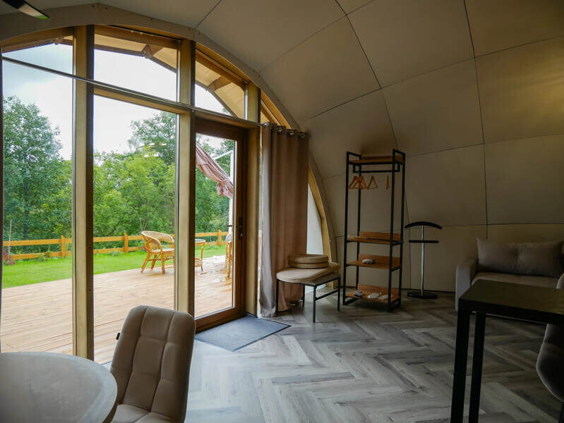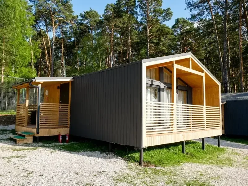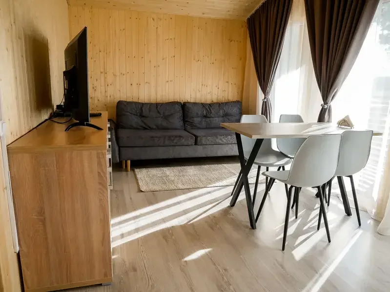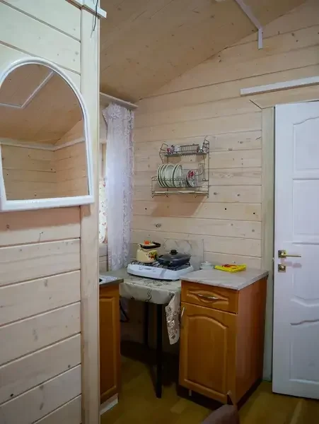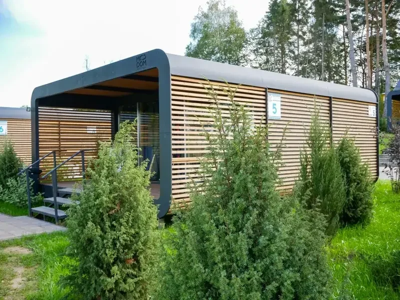 Современный комфортабельный модульный дом-студия с полностью оборудованной кухней, обеденной зоной и панорамными окнами. В доме есть двуспальная кровать и раскладывающийся диван. Санузел с водонагревателем, фен.