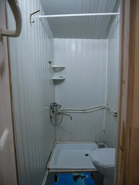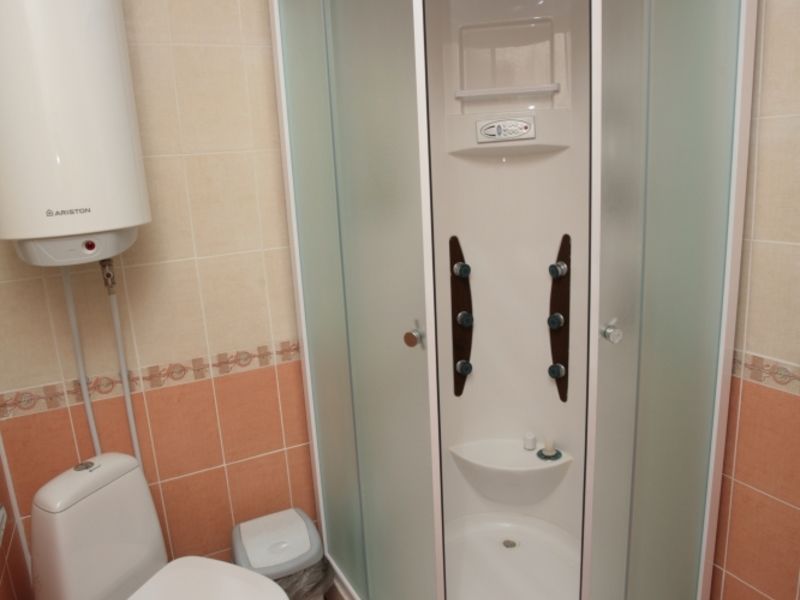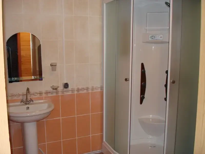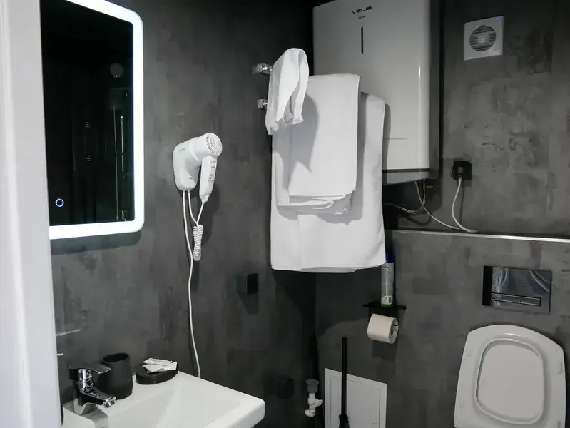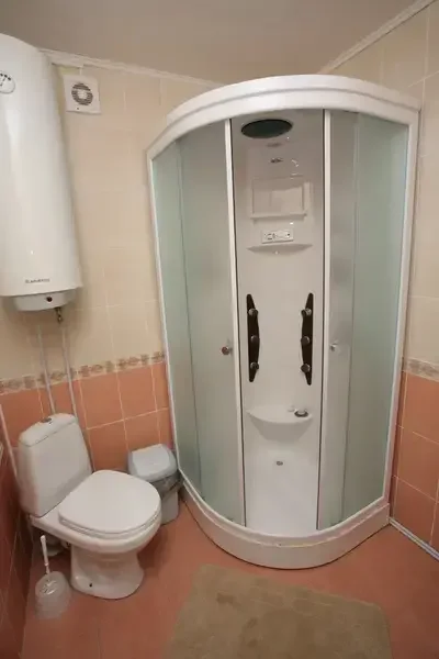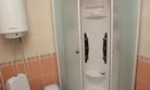 санузел оборудован душевой кабиной, унитазом, раковиной и полотенцесушителем, а также аксессуарами для ванной комнаты, полотенцами и необходимыми предметами для уборки помещения.