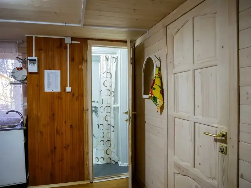 Внутри: веранда, 2 спальные комнаты, в которых по 2 односпальные кровати, прикроватные тумбы, двустворчатый шкаф, 4 комплекта постельного белья; кухня, в которой располагаются кухонный стол со стульями, холодильник, газовая плита, раковина, кухонный гарнитур с необходимым набором посуды, рассчитанным на 4 персоны (столовые приборы, глубокие и мелкие тарелки, стаканы, чайный сервиз), набором посуды для приготовления пищи (набор кастрюль, сковорода, чайник, кухонный нож, разделочная доска) и другой кухонной утварью. Санузел оборудован душем (холодная и горячая вода), унитазом, а так же аксессуарами для ванной комнаты, полотенцами и необходимыми предметами для уборки помещения.