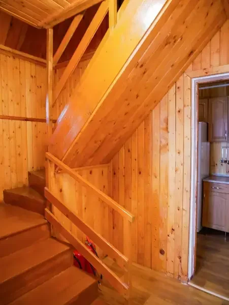 1 этаж: спальная комната, в которой 2 односпальные кровати, прикроватные тумбы, двустворчатый шкаф, 2 комплекта постельного белья; кухня, в которой располагаются кухонный стол со стульями, холодильник, газовая плита, раковина, кухонный гарнитур с необходимым набором посуды, рассчитанным на 6 персон (столовые приборы, глубокие и мелкие тарелки, стаканы, чайный сервиз), набором посуды для приготовления пищи (набор кастрюль, сковорода, чайник, кухонный нож, разделочная доска) и другой кухонной утварью. Санузел оборудован душем (холодная и горячая вода), унитазом, а так же аксессуарами для ванной комнаты, полотенцами и необходимыми предметами для уборки помещения.