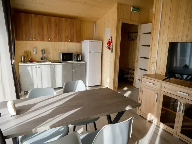 Внутри: 2 спальные комнаты, в которых по 2 односпальные кровати, прикроватные тумбы, двустворчатый шкаф, 4 комплекта постельного белья; кухня, в которой располагаются: кухонный стол со стульями, холодильник, газовая плита, раковина, кухонный гарнитур с необходимым набором посуды, рассчитанным на 4 персоны (столовые приборы, глубокие и мелкие тарелки, стаканы, бокалы), набором посуды для приготовления пищи (набор кастрюль, сковорода, чайник, кухонный нож, разделочная доска) и другой кухонной утварью. Санузел оборудован душем (холодная и горячая вода), унитазом, а так же аксессуарами для ванной комнаты, полотенцами и необходимыми предметами для уборки помещения.
