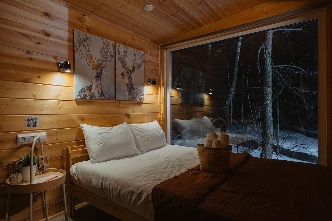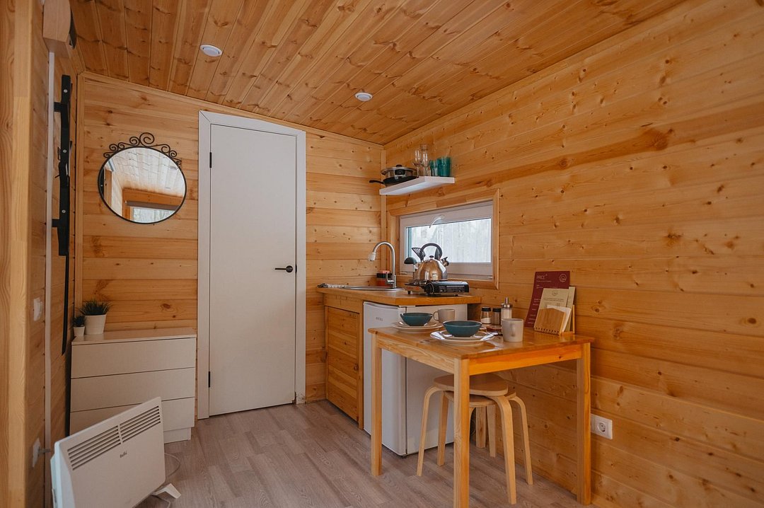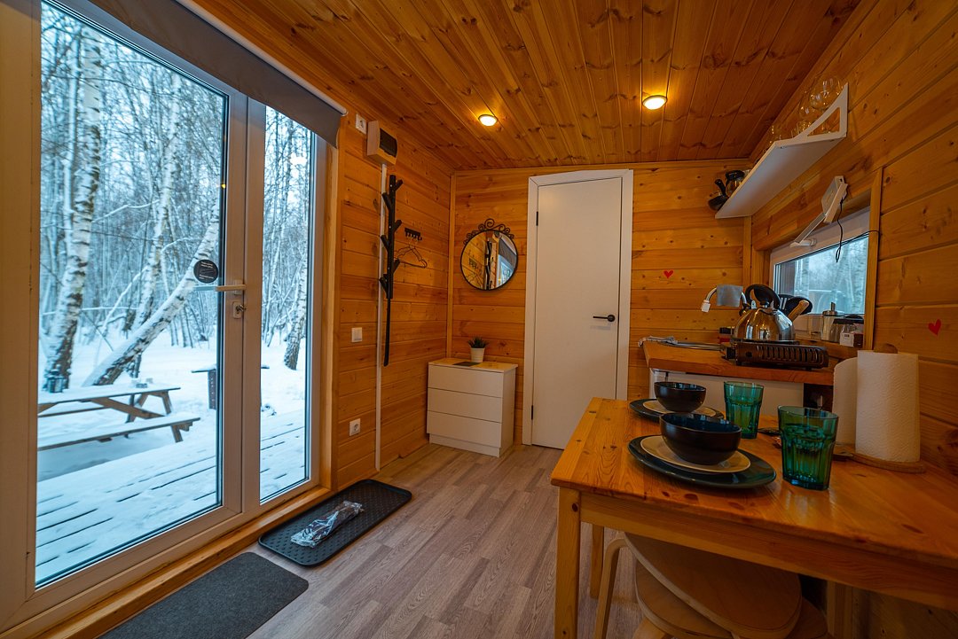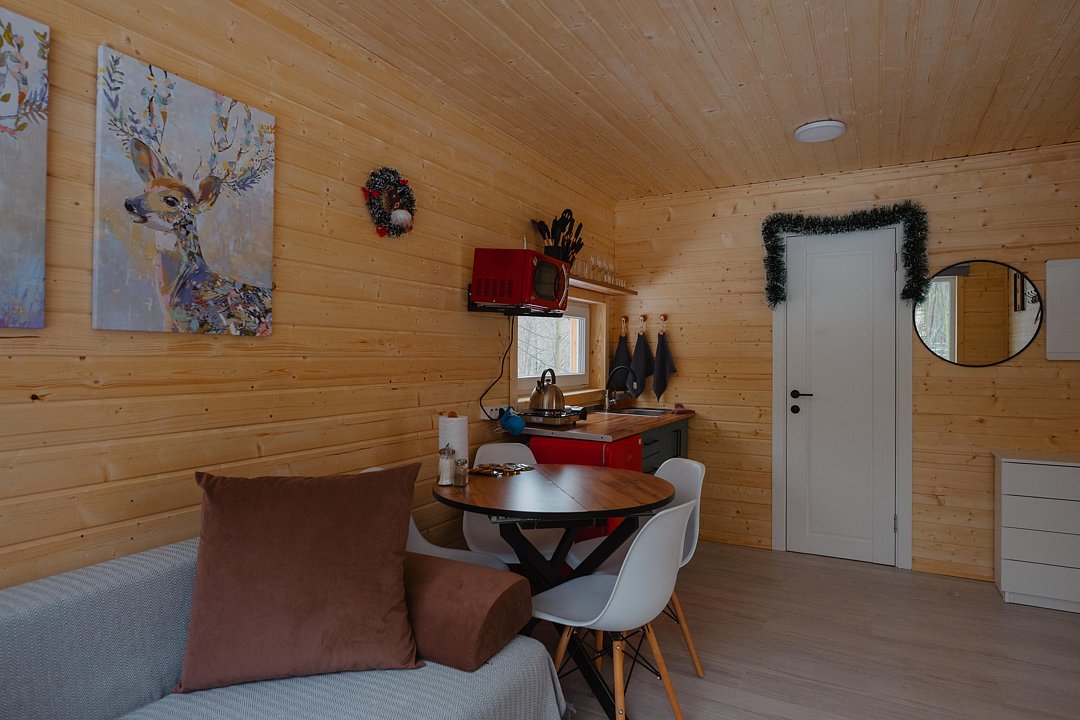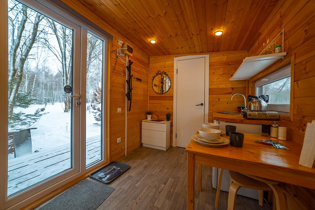 В доме на 6-х человек с большим панорамными окнами есть 2 спальни, а также кухня-гостиная с раскладывающимся диваном. В домике есть оборудованная кухня с холодильником и микроволновкой, санузел с душем, терраса с мебелью и мангальной зоной.
