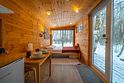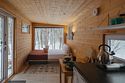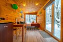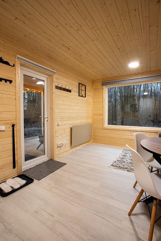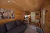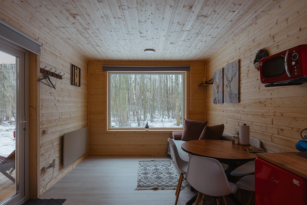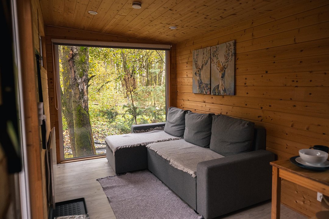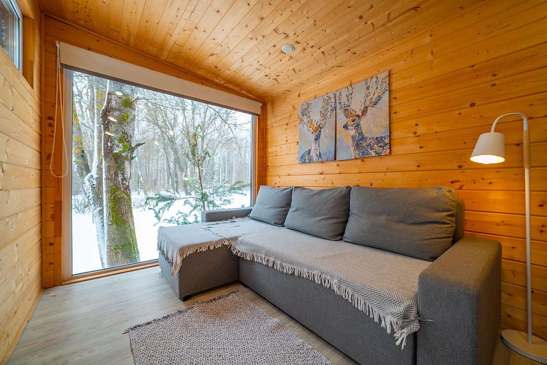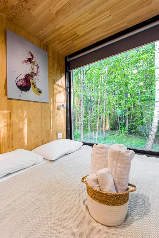 В доме на 6-х человек с большим панорамными окнами есть 2 спальни, а также кухня-гостиная с раскладывающимся диваном. В домике есть оборудованная кухня с холодильником и микроволновкой, санузел с душем, терраса с мебелью и мангальной зоной.