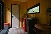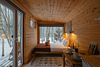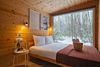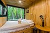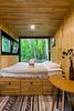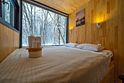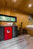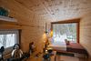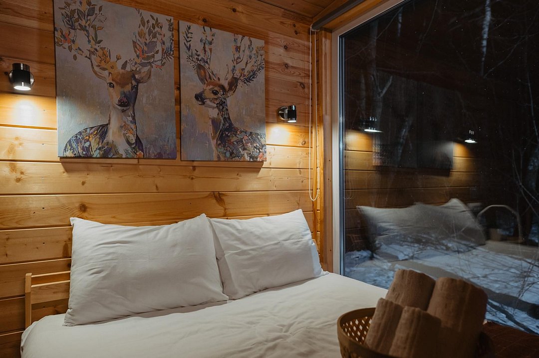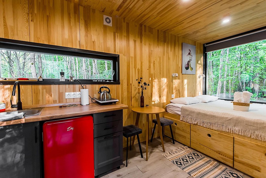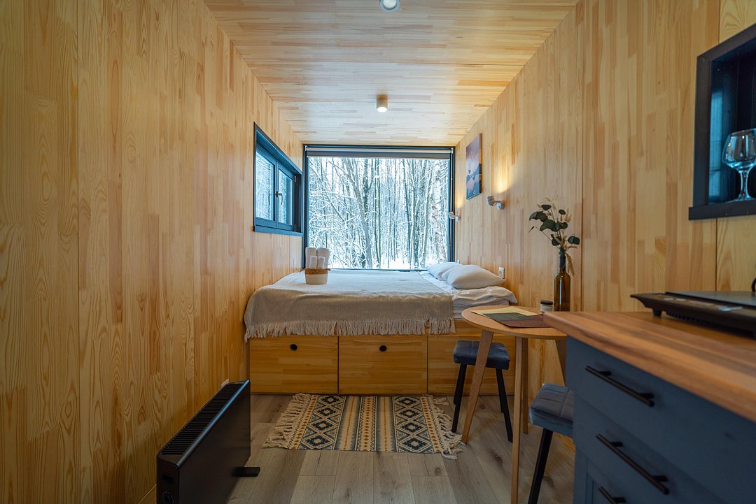 Внутри полноценная двуспальная кровать, камин, холодильник, обеденный стол со стульями и обогреватель, чтобы всегда было тепло.