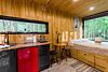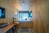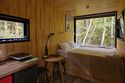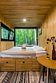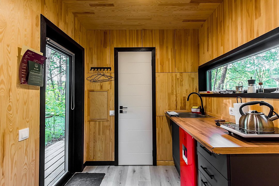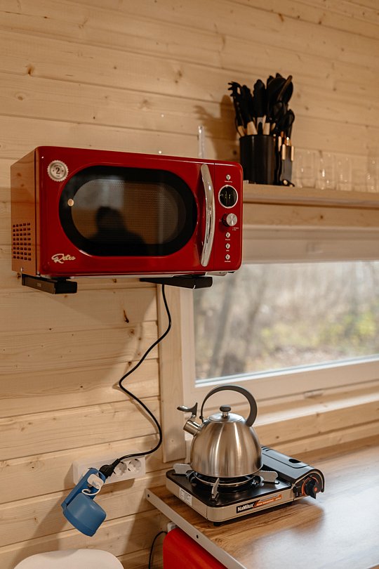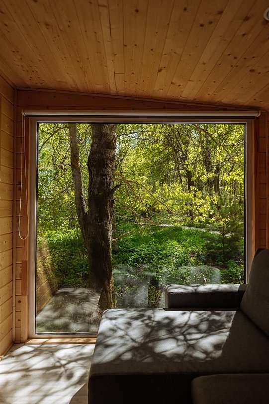 В доме с большим панорамным окном есть двуспальная кровать, кухня, холодильник и санузел с душем, есть терраса с мебелью и все принадлежности для барбекю.