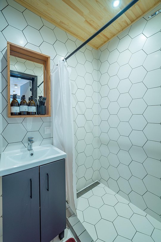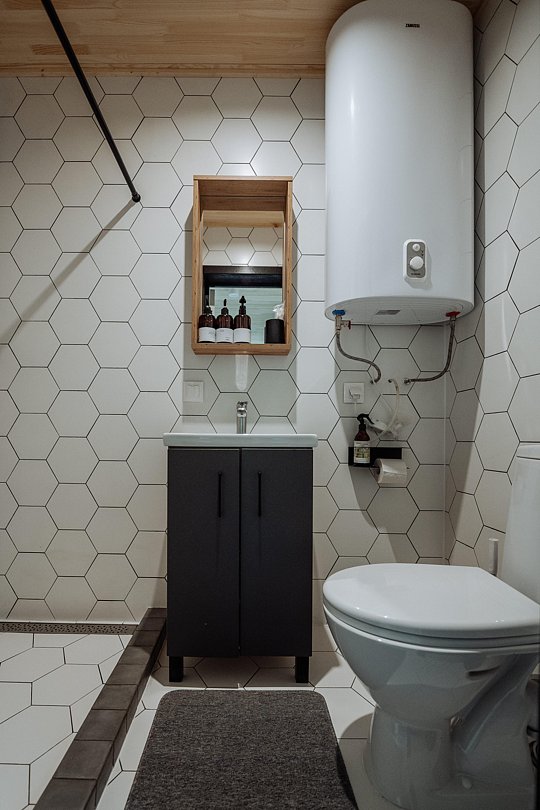 Санузел с душем, кухонная зона, мангальная зона, мини-холодильник
